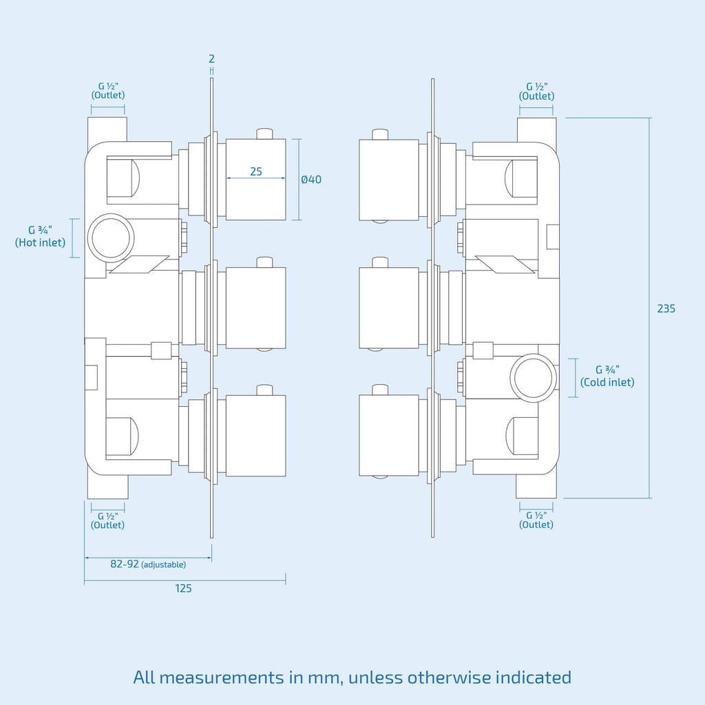- Built in non return valves to prevent back flow and filters to protect the thermostatic mechanism