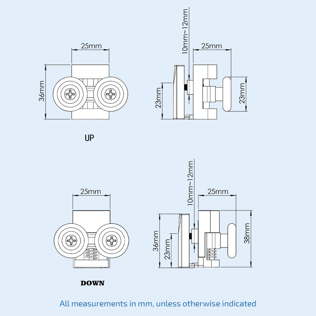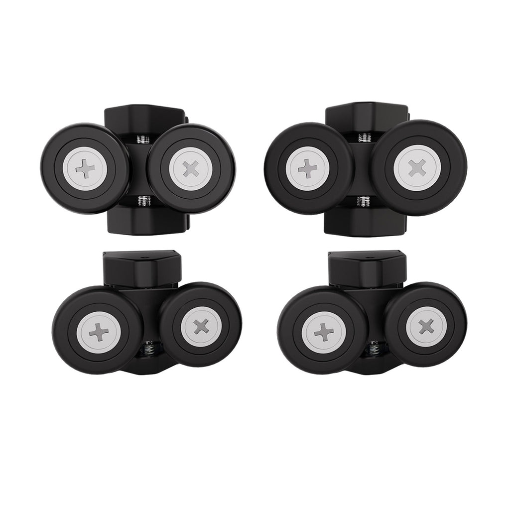A pack of shower door wheels 2x double upper wheels and 2x double bottom wheels.