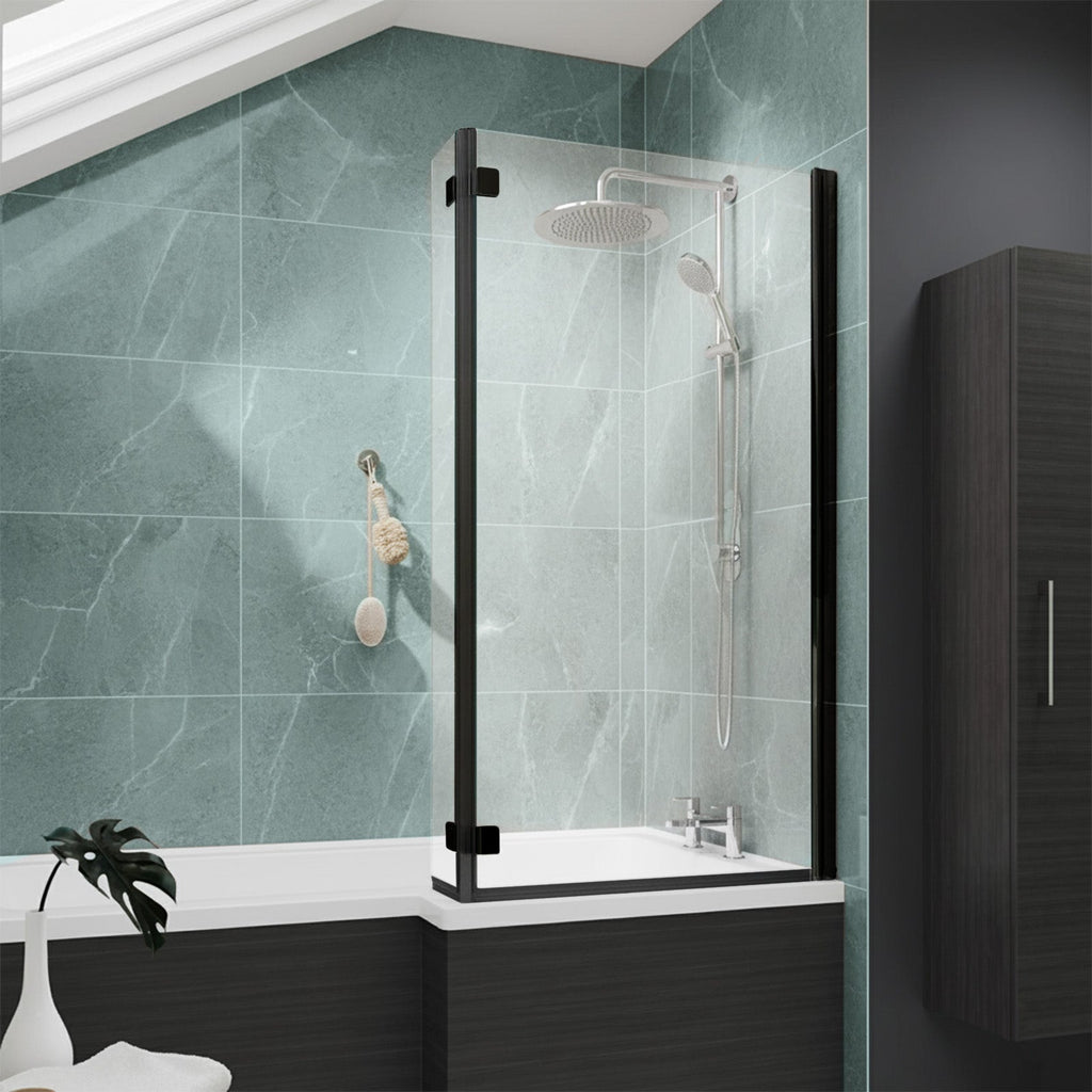 The minimalist L-shaped bath screen featuring a clear toughened glass with a sleek aluminium vertical wall profile. Designed to prevent water splashes while maintaining an open, modern aesthetic, it’s ideal for contemporary bathrooms with shower-over-bath setups.