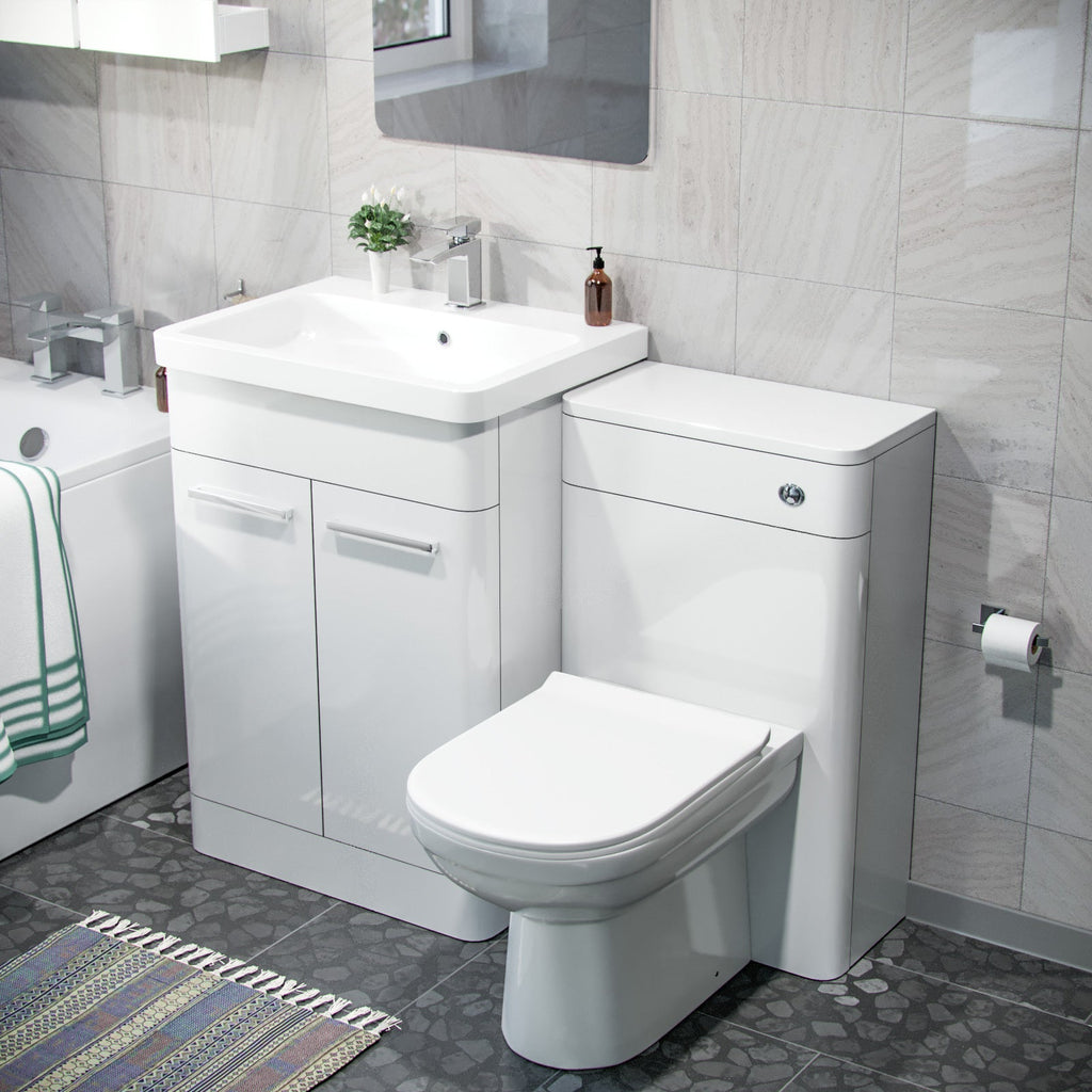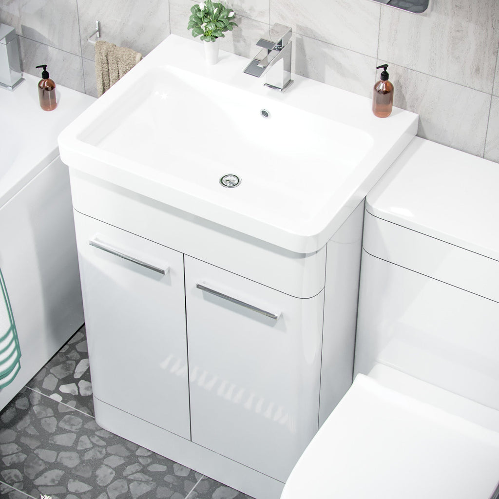 A great combination of essential bathroom products including a 1700mm bath tub, 600mm freestanding basin vanity cabinet unit, and a combination of a WC unit and a ceramic back to wall toilet.