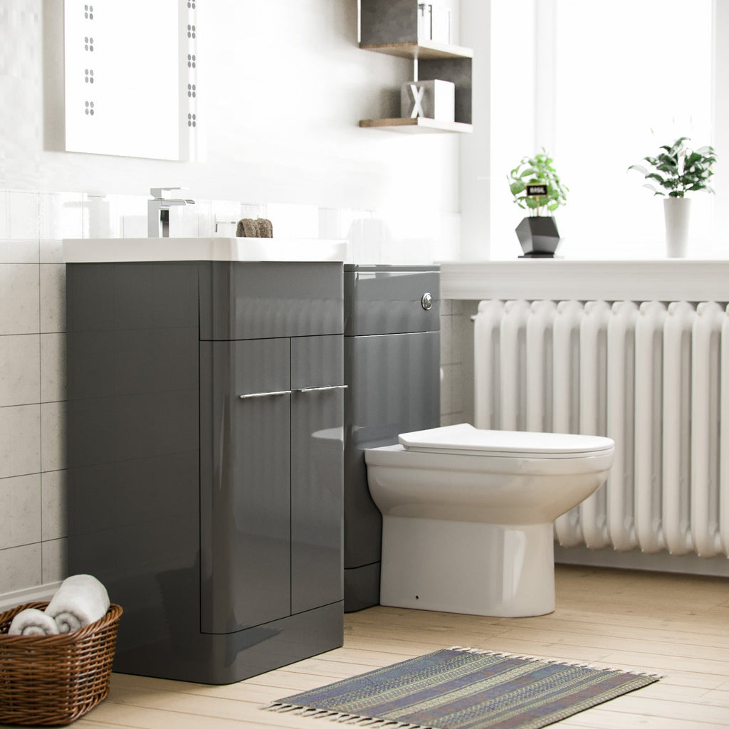 Our Grey Freestanding cabinet, WC Unit and back to wall toilet are practical and modern.