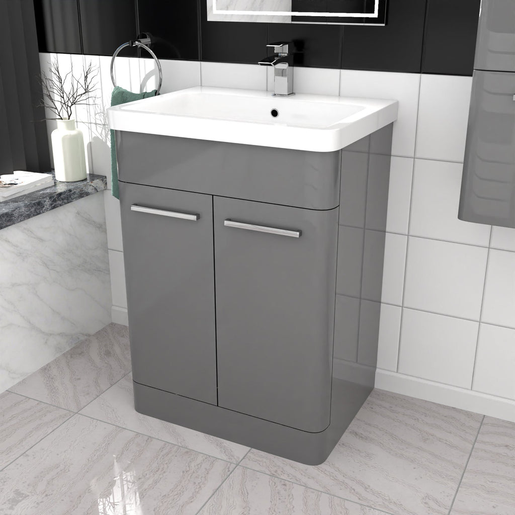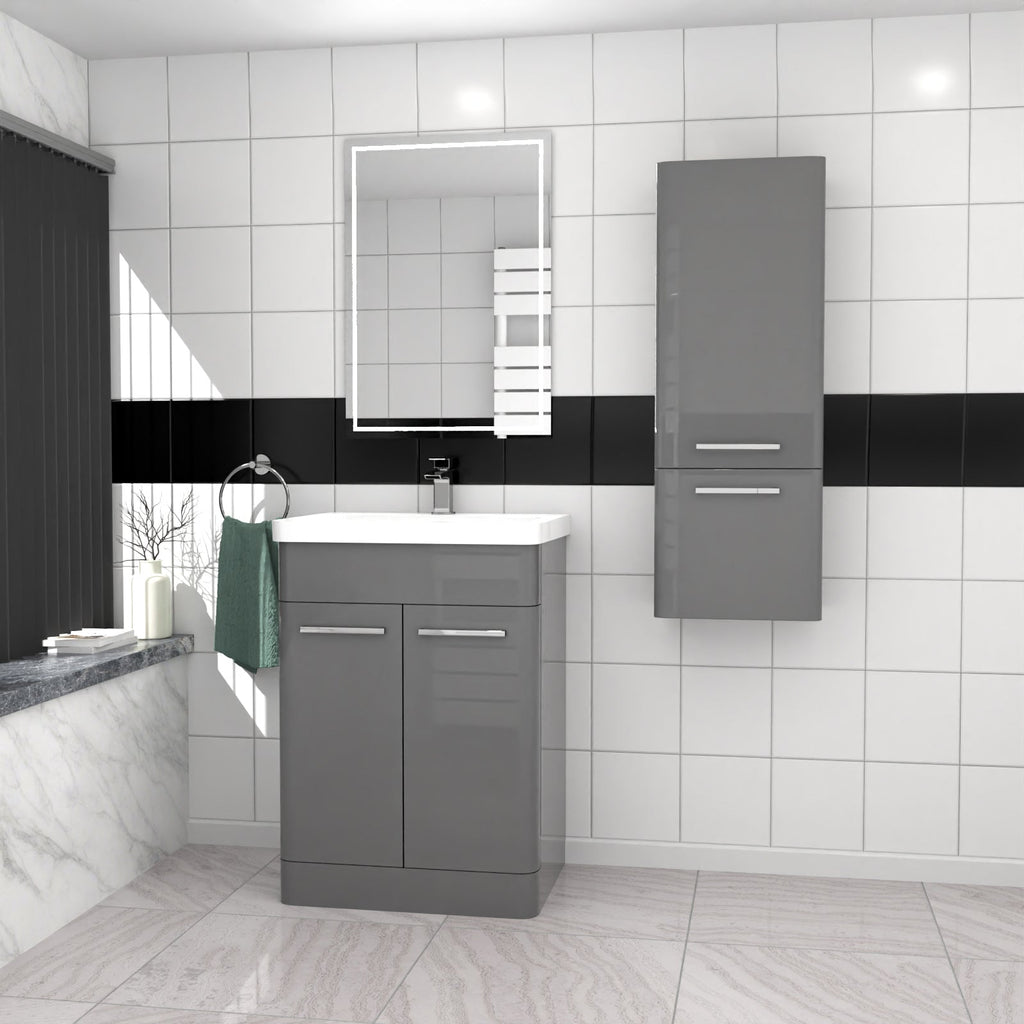 Our 600mm Freestanding Grey Basin Vanity & 350mm Wall Hung Tall Cabinet Set offers a stylish storage solution and functionality of daily use. This set has a sleek rounded corner design which can complement a modern look to the bathroom interior. The basin vanity unit and the tall cabinet both come with 2 doors with handles providing ample space for storage. Also the adjustable shelving units in the tall cabinet can keep your bathroom essentials neat and organised. The furniture set is made with high quality MDF material with gloss finish making it an excellent choice for you to upgrade your bathroom interior.