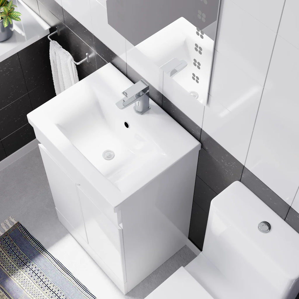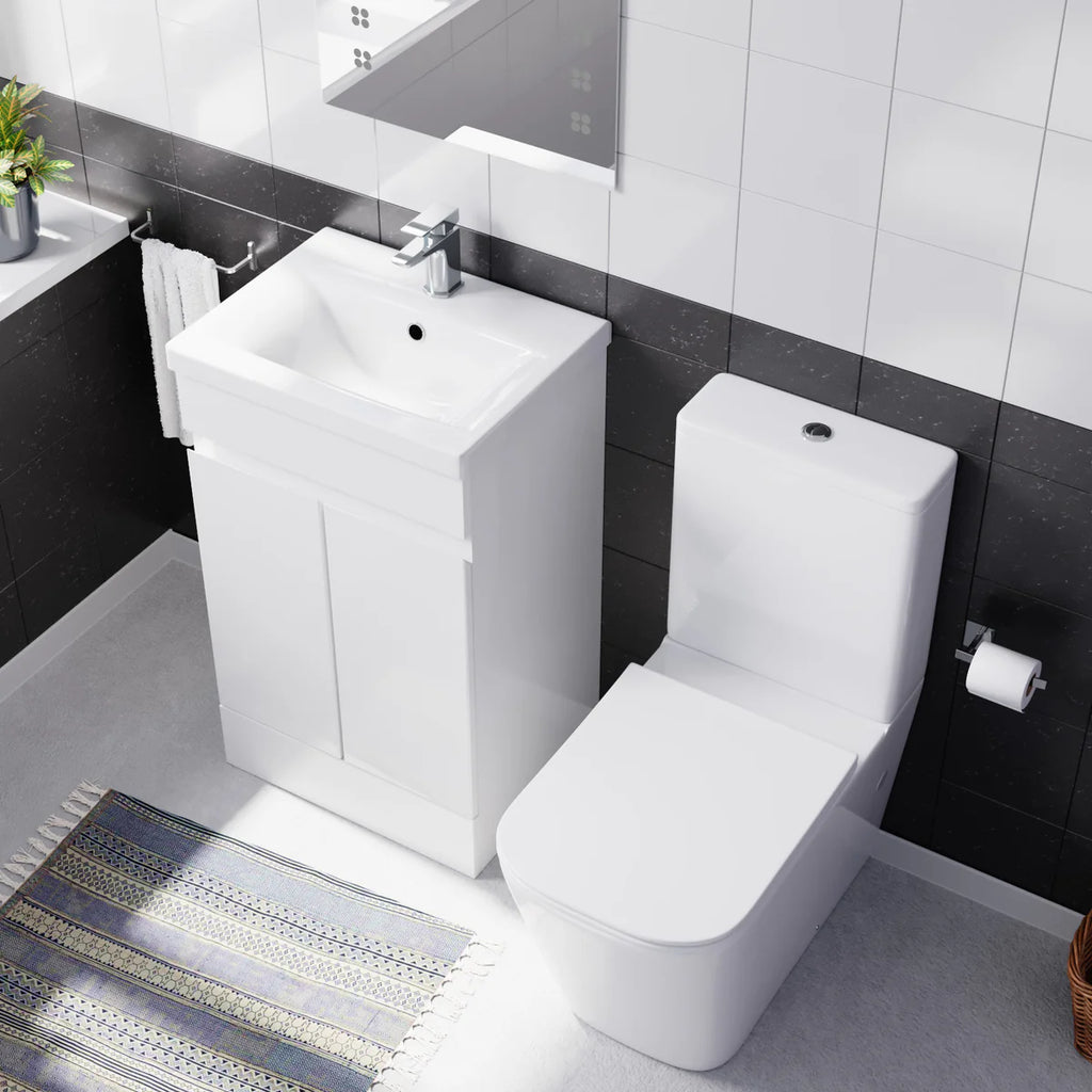 This 500mm freestanding basin vanity and close-coupled toilet set offers ample storage and washing space while minimising the space taken up in your bathroom. The vanity unit is a stylish and functional addition to any bathroom, featuring a high-quality ceramic basin and shelving underneath, making it ideal for everyday use. The vanity unit is constructed with water-resistant materials and has a sleek gloss finish, adding a modern touch to your bathroom. Also, our close-coupled toilet comes complete with a dual flush cistern and soft closed seat, making it safe for people of all ages to use and helping prevent fingers from getting trapped. This furniture combination is ideal for any modern bathroom.
