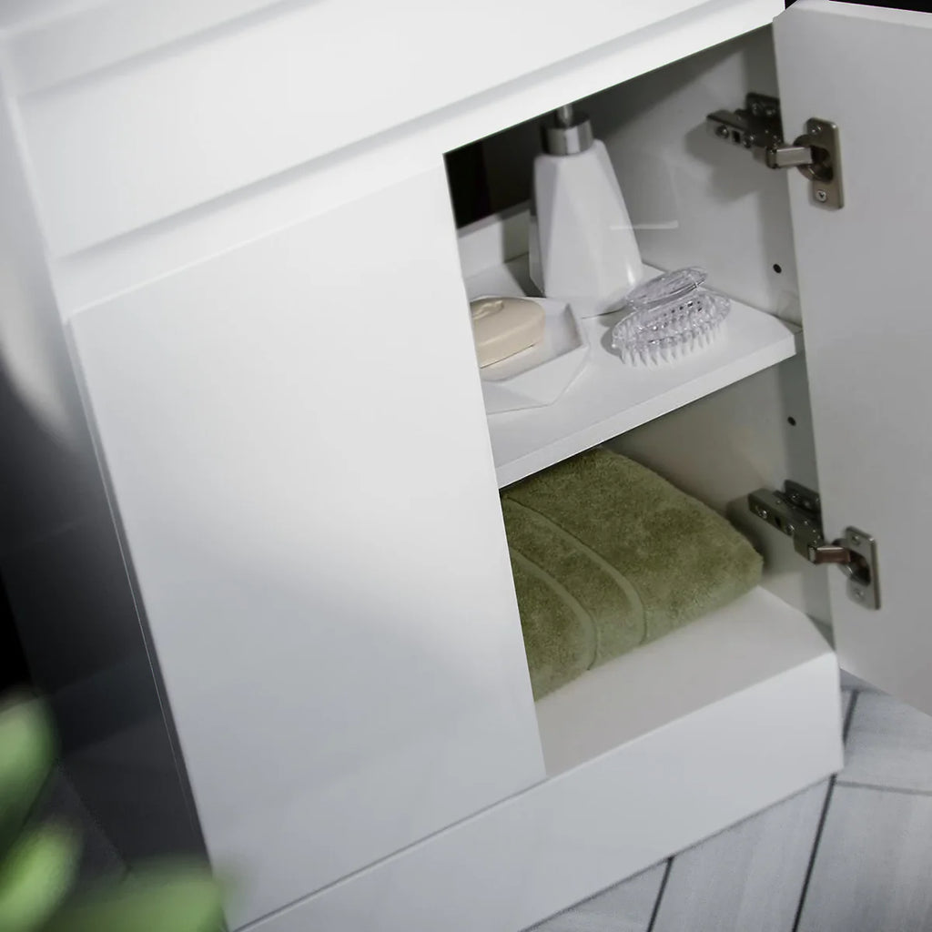 - Easy access bathroom storage with soft closing doors