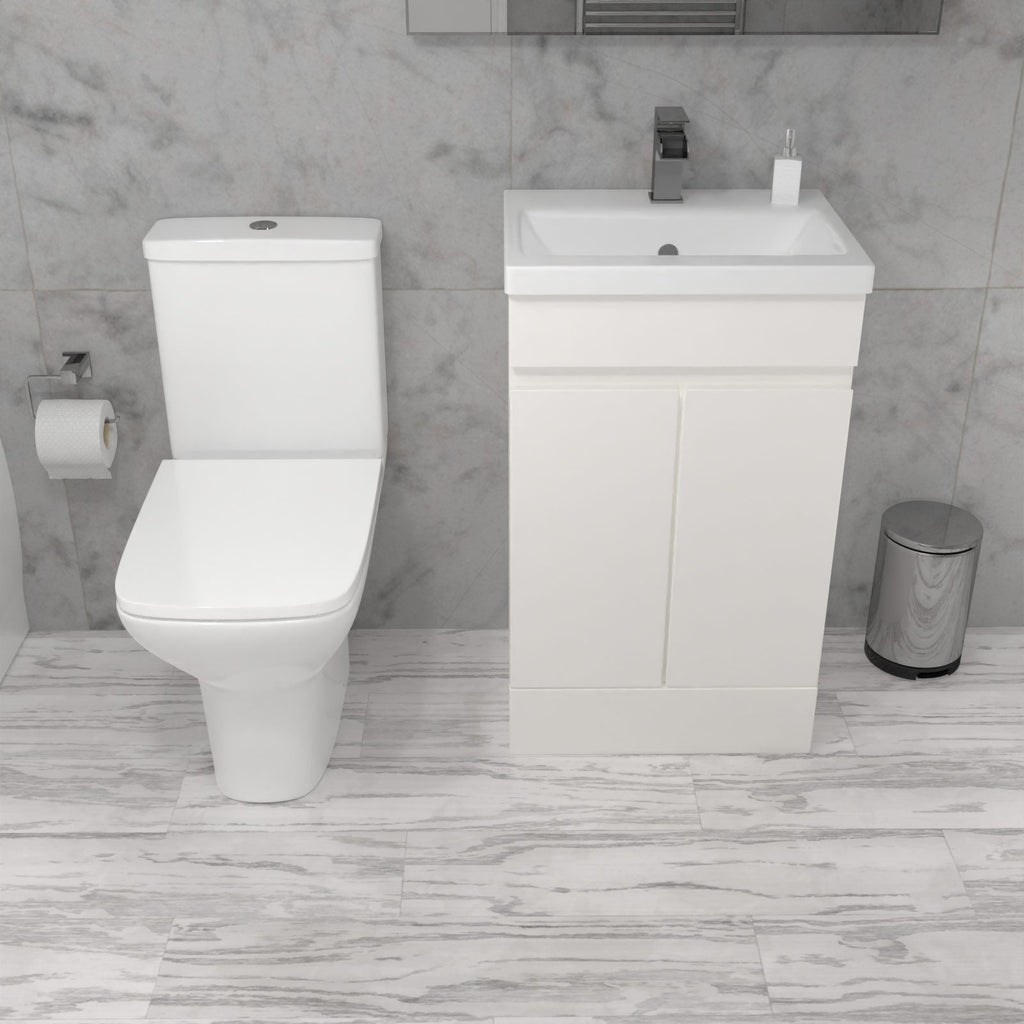 This furniture set comes with the Alaska 500mm freestanding basin vanity and Oakham close coupled rimless toilet.
