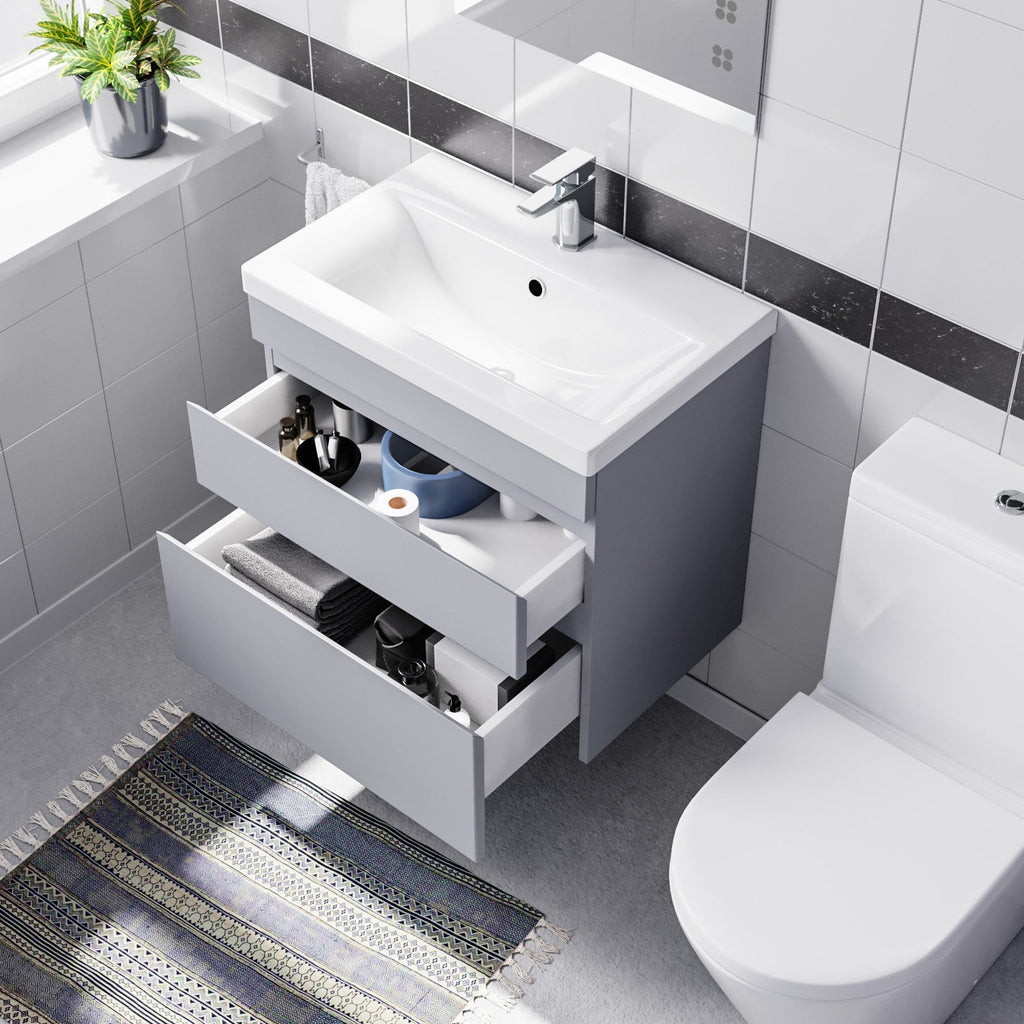 The beautiful 600mm Wall Hung Vanity Unit 2 Drawer Cabinet comes complete with a high-quality basin, Our bathroom Drawer Cabinet & Sink Basin units are ideal for family bathrooms and add a touch of style to a practical space.