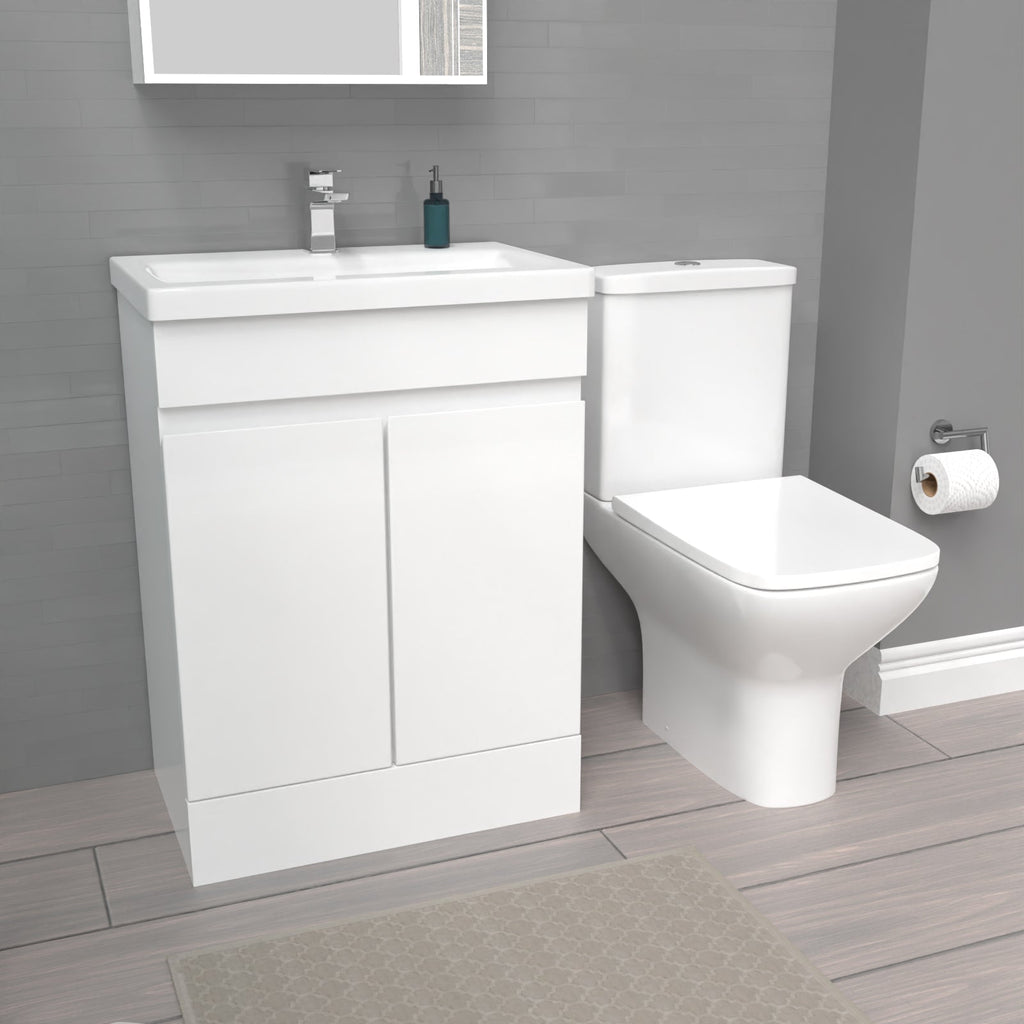 This furniture set comes with the Alaska 600mm freestanding basin vanity and Oakham close coupled rimless toilet.