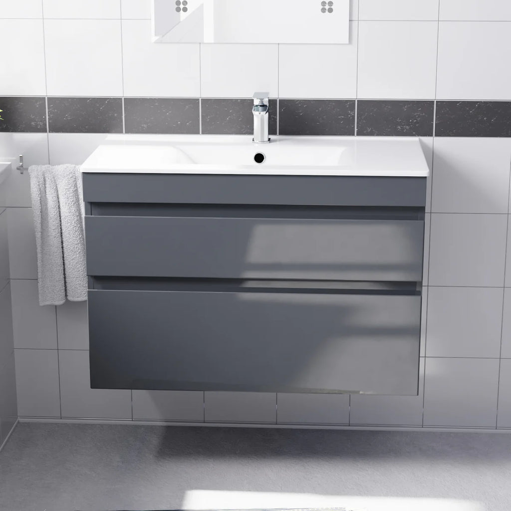 Our 800mm Wall Hung 2 Drawer Vanity Unit Cabinets bathroom storage units are ideal for family bathrooms and add a touch of style to a practical space.
