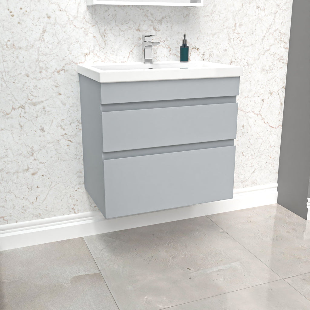 Introducing the Hardie 600mm 2 Drawer Wall Hung Vanity Cabinet and Basin Sink Unit. This stylish and practical bathroom storage solution features a stunning 600 mm matt grey wall-hung basin vanity unit. It comes equipped with a high-quality countertop basin, designed for everyday use. With its durable construction and exquisite finish, our Basin Vanity Unit offers the perfect blend of functionality and elegance. Upgrade your bathroom with this beautiful and reliable addition.