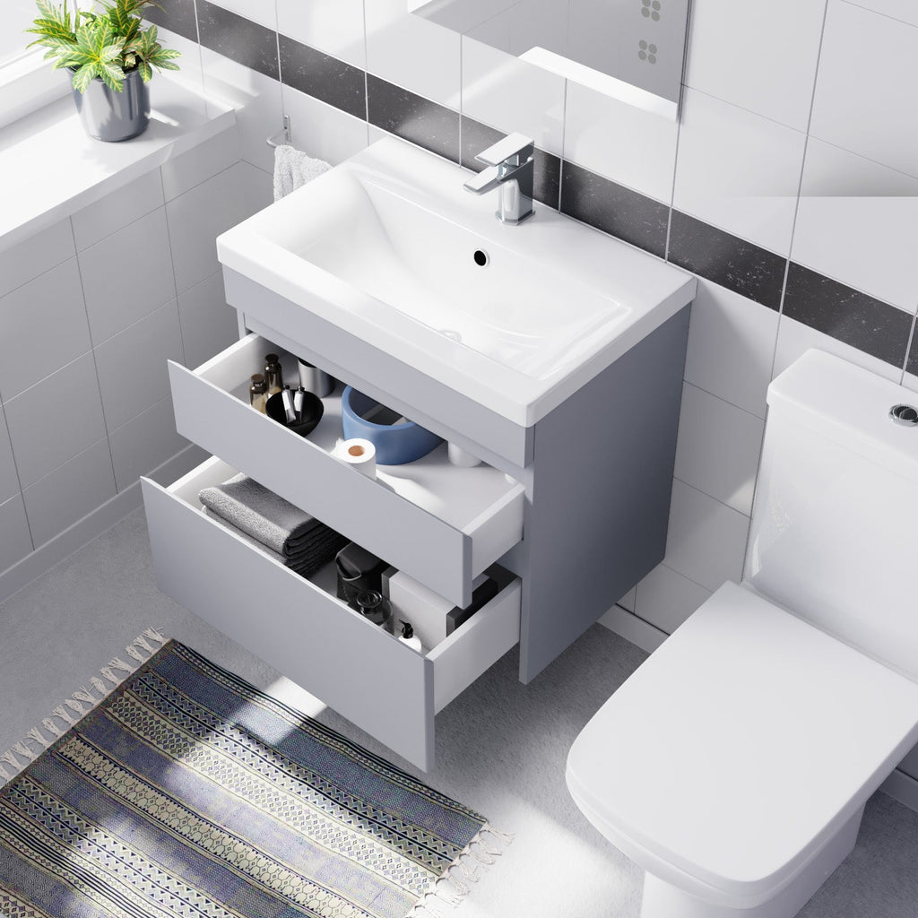 The beautiful 600mm Wall Hung Vanity Unit 2 Drawer Cabinet comes complete with a high-quality basin, Our bathroom Drawer Cabinet & Sink Basin units are ideal for family bathrooms and add a touch of style to a practical space.