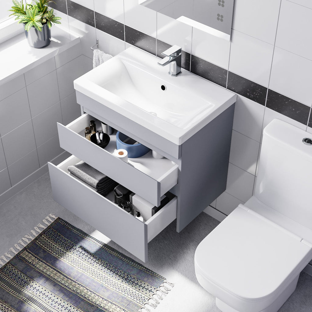 The beautiful 600mm Wall Hung Vanity Unit 2 Drawer Cabinet comes complete with a high-quality basin, Our bathroom Drawer Cabinet & Sink Basin units are ideal for family bathrooms and add a touch of style to a practical space.