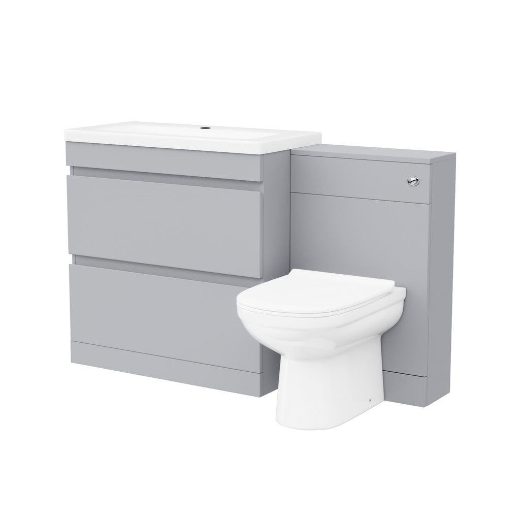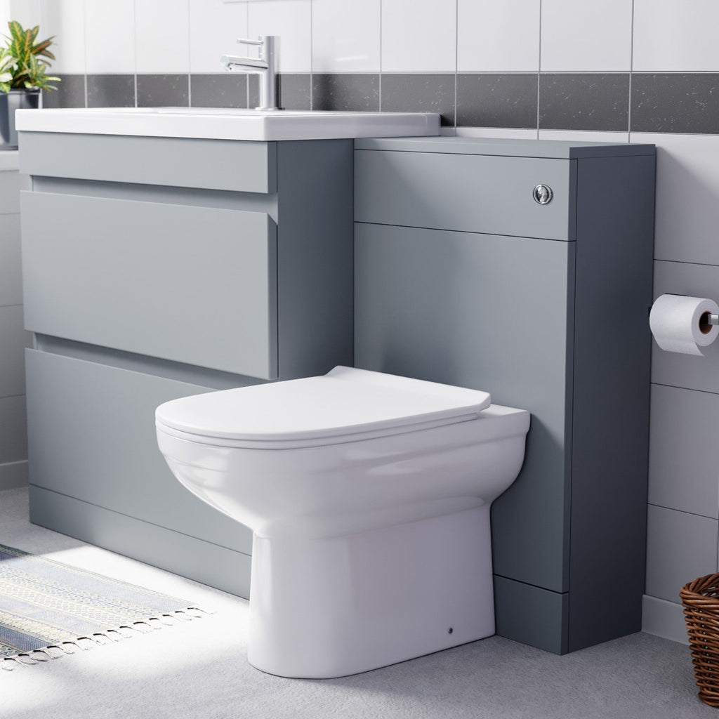- Compact basin vanity and toilet set for efficient bathroom space utilization.