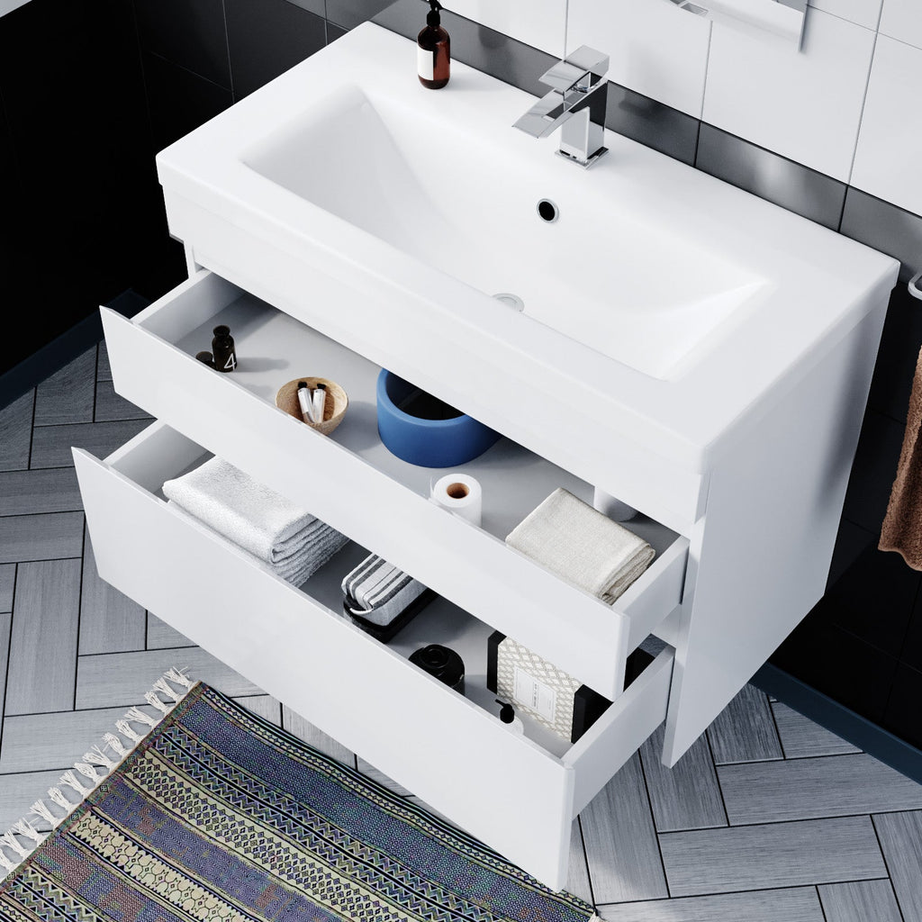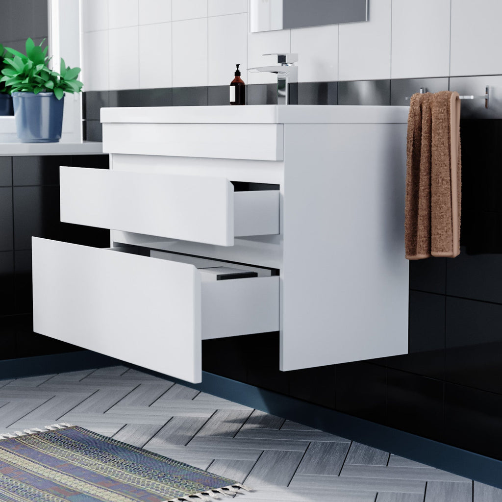 The Alaska Minimalist 800mm Wall Hung Gloss White Basin Vanity Sink Unit is the perfect choice for anyone looking for a stylish and functional bathroom vanity unit. With a sleek and minimalist design, this unit features two spacious drawers that provide ample storage space for your bathroom essentials. The unit's gloss white finish creates a modern and contemporary look that is sure to impress.