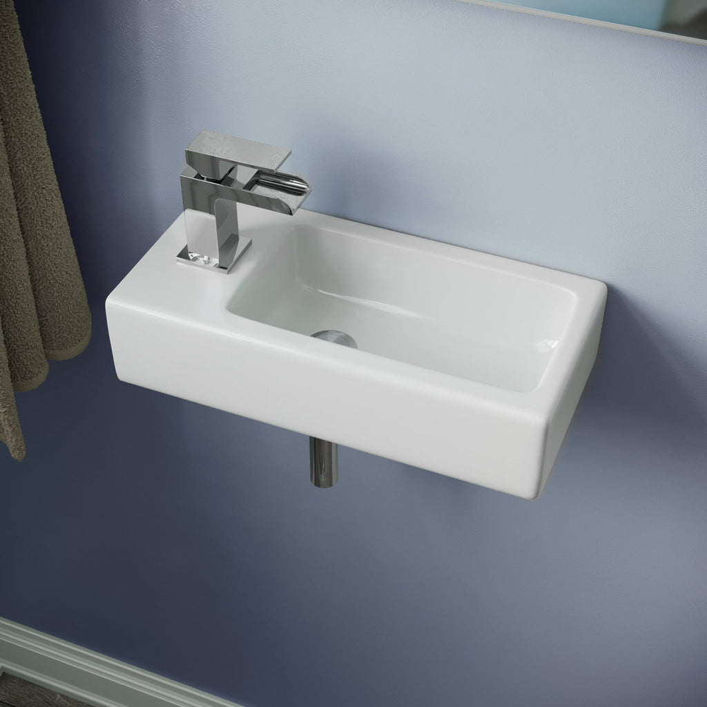 Crafted from high-quality Vitreous China, the compact white wall-hung basin offers exceptional durability and a smooth ceramic surface that is both visually appealing and easy to clean. The premium-grade glazing ensures a seamless finish, enhancing the basin's sleek appearance while making maintenance a breeze.