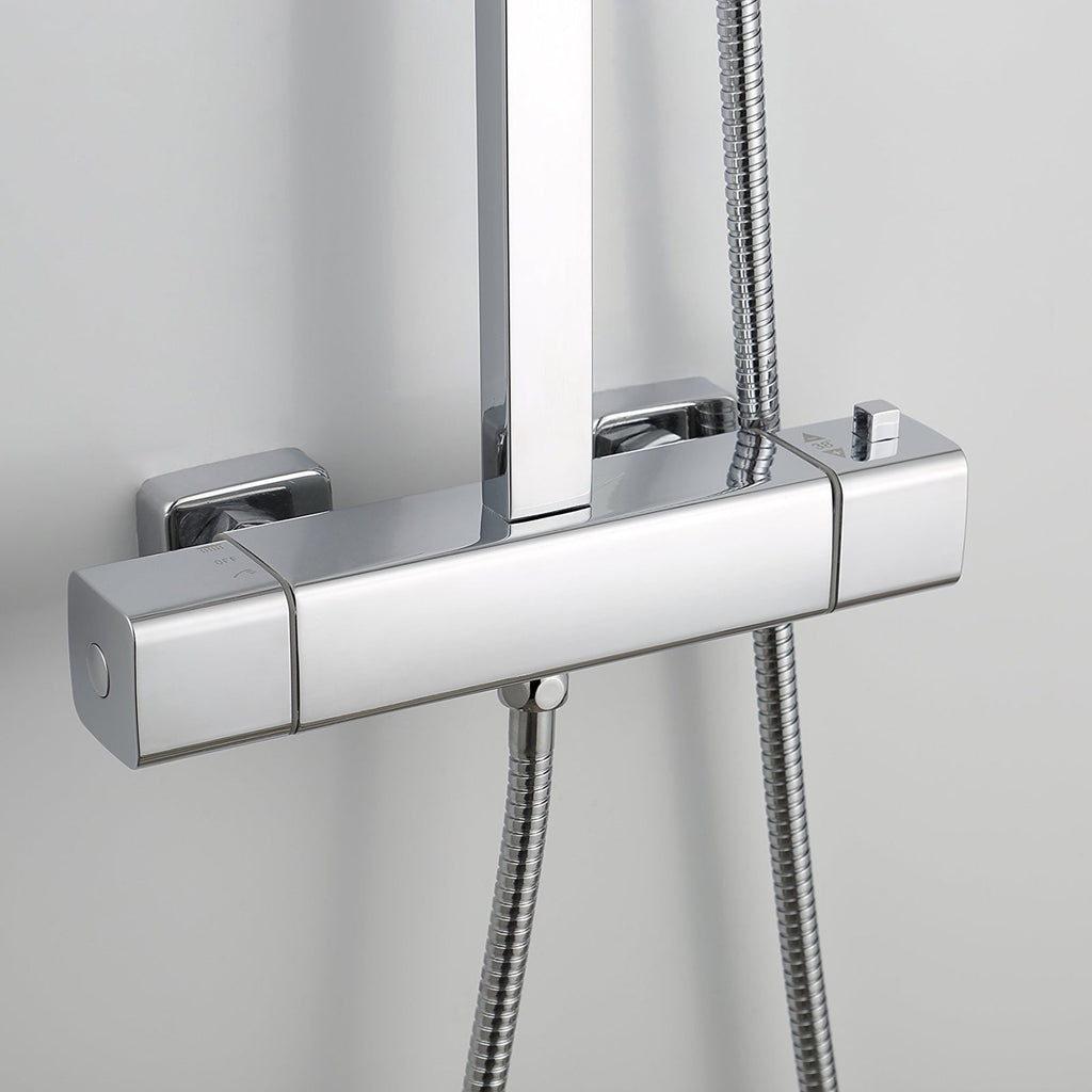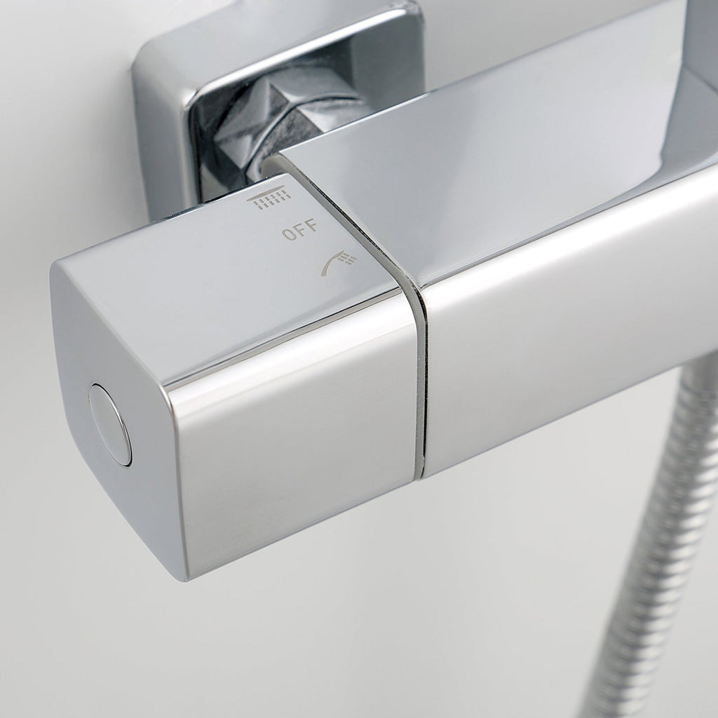 The Anson thermostatic bar shower mixer features a designed square chrome plated bar valve with square dials, a seamless rigid riser kit, combined with a large square slim fixed shower head and and a hand-held shower handset, it comes complete with a wall fixing bracket for complete stability and a flexible shower hose for maximum versatility.