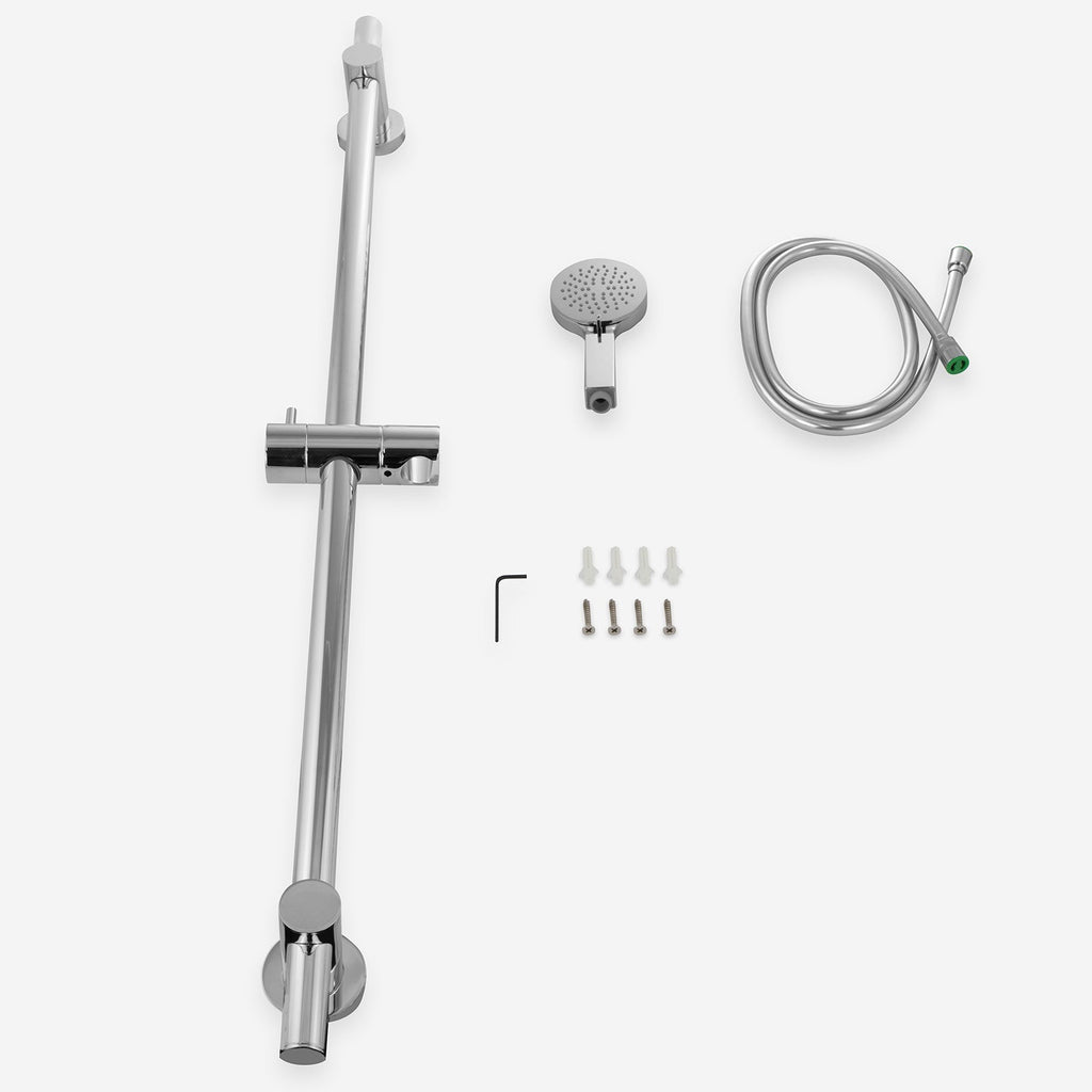 This slider rail sets come with a multi-function handset, featuring 3 spraying functions, which are easily adjustable to suit your own requirements. The shower kit includes a sliding rail, a matching shower handset, and a flexible shower hose.