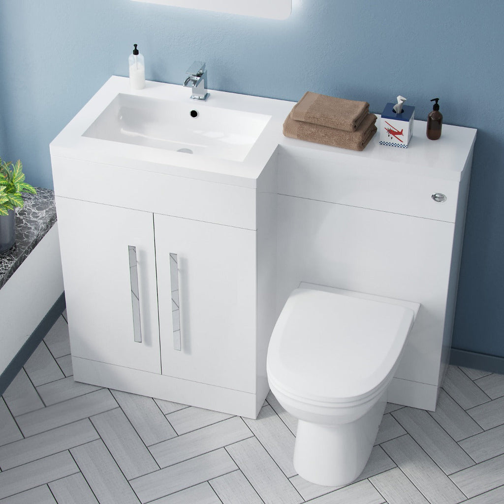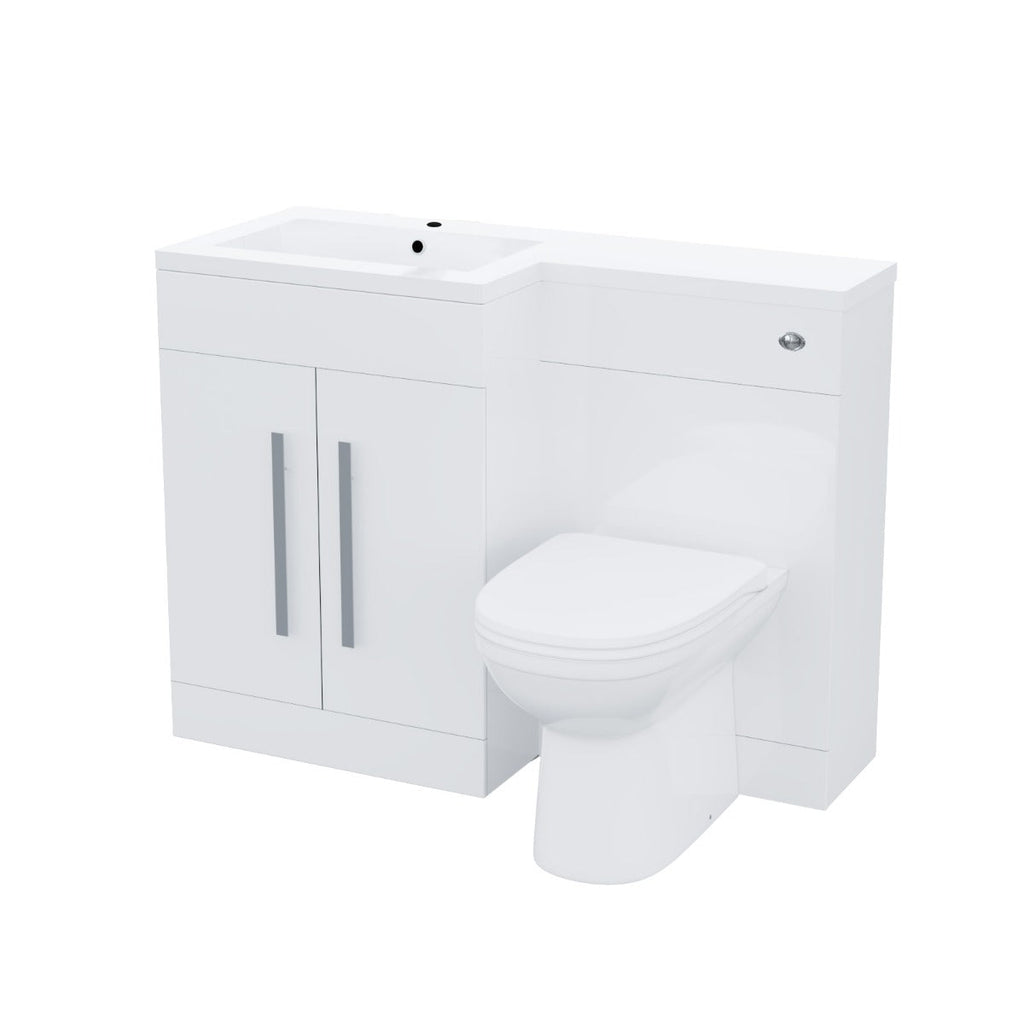 The stylish Aric floor standing combination basin and WC unit with white poly marble basin top, modern white gloss bathroom furniture with two doors and contemporary chrome effect handles will bring a trendy look to your bathroom. Its trendy design hides all unsightly pipework creating a neat clean look. The WC unit can be drilled for right or left-hand front flush. Supplied with a WRAS approved concealed cistern with chrome dual flush button. Also available in Right hand.