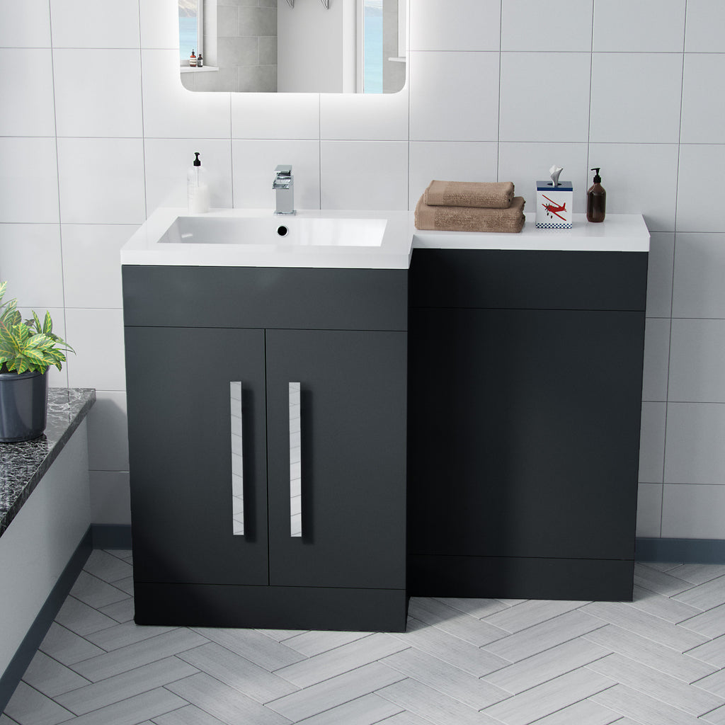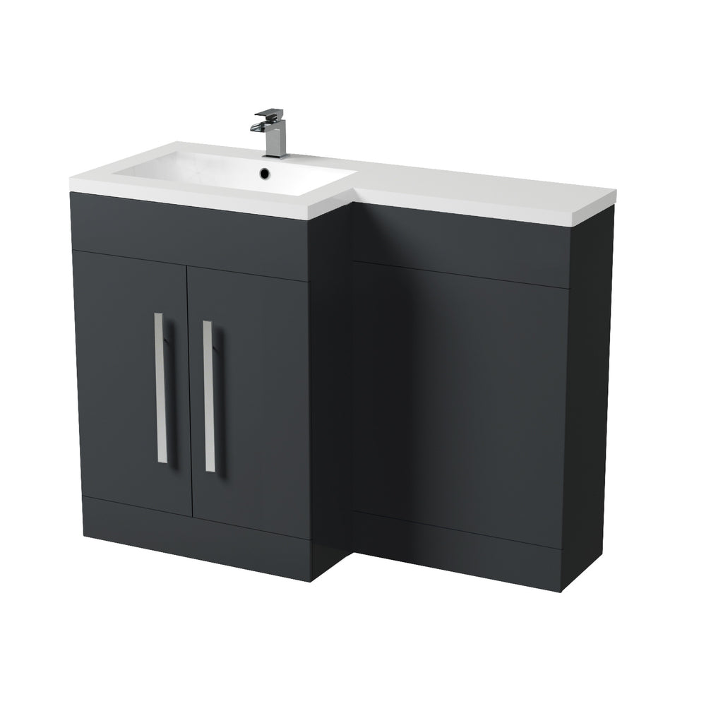 It features a white resin basin top, with a two door water resistant MDF cabinet, WC Unit and contemporary chrome effect handles, bringing a modern look to your bathroom.