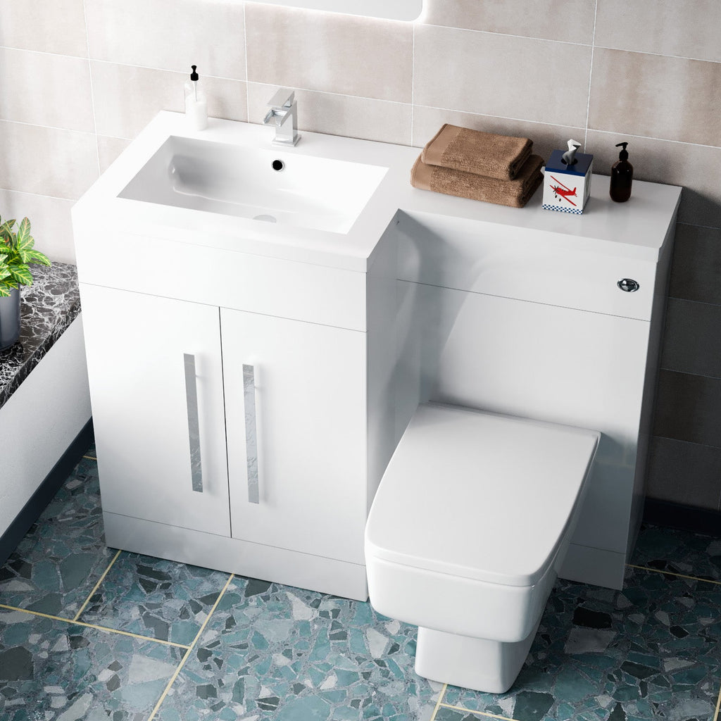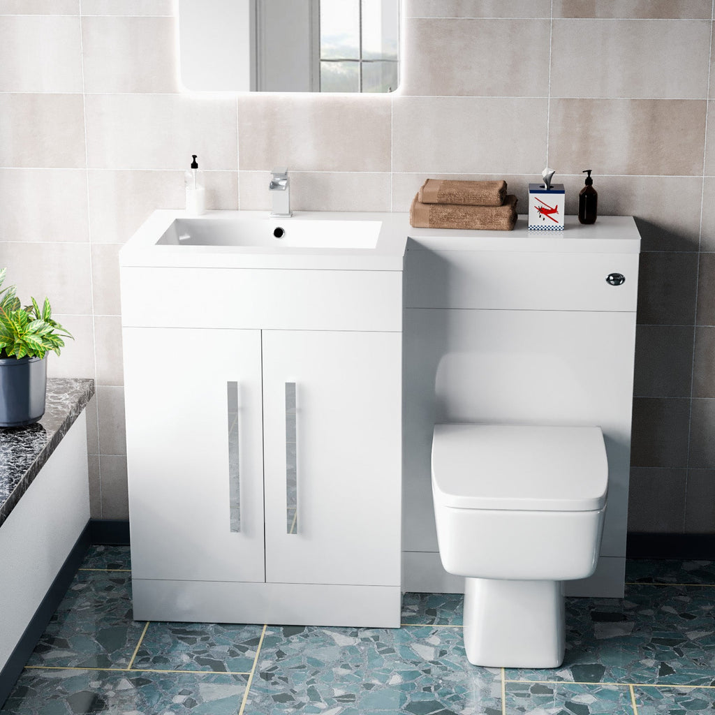 Introducing the 1100mm Freestanding White Basin Vanity Unit with WC Unit & BTW Toilet, a sleek and practical addition to your bathroom. This all-in-one solution features a clean white finish that effortlessly complements any décor style. With ample storage space in the basin vanity unit and a space-saving back-to-wall toilet, it's perfect for maximizing functionality in your bathroom. Enjoy convenience and style with this complete set.