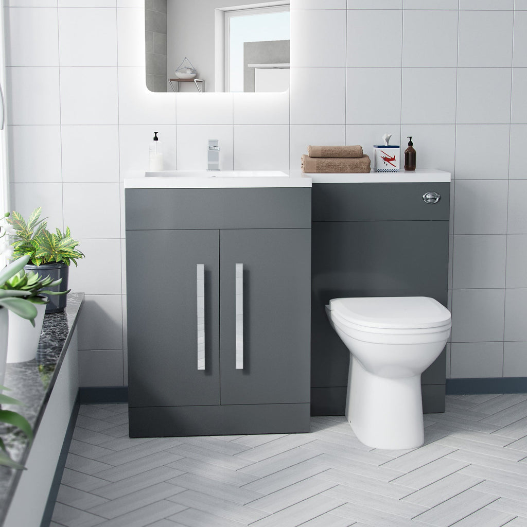 It features a white resin basin top, with a two door water resistant MDF cabinet and WC unit and contemporary chrome effect handles, bringing a modern look to your bathroom.