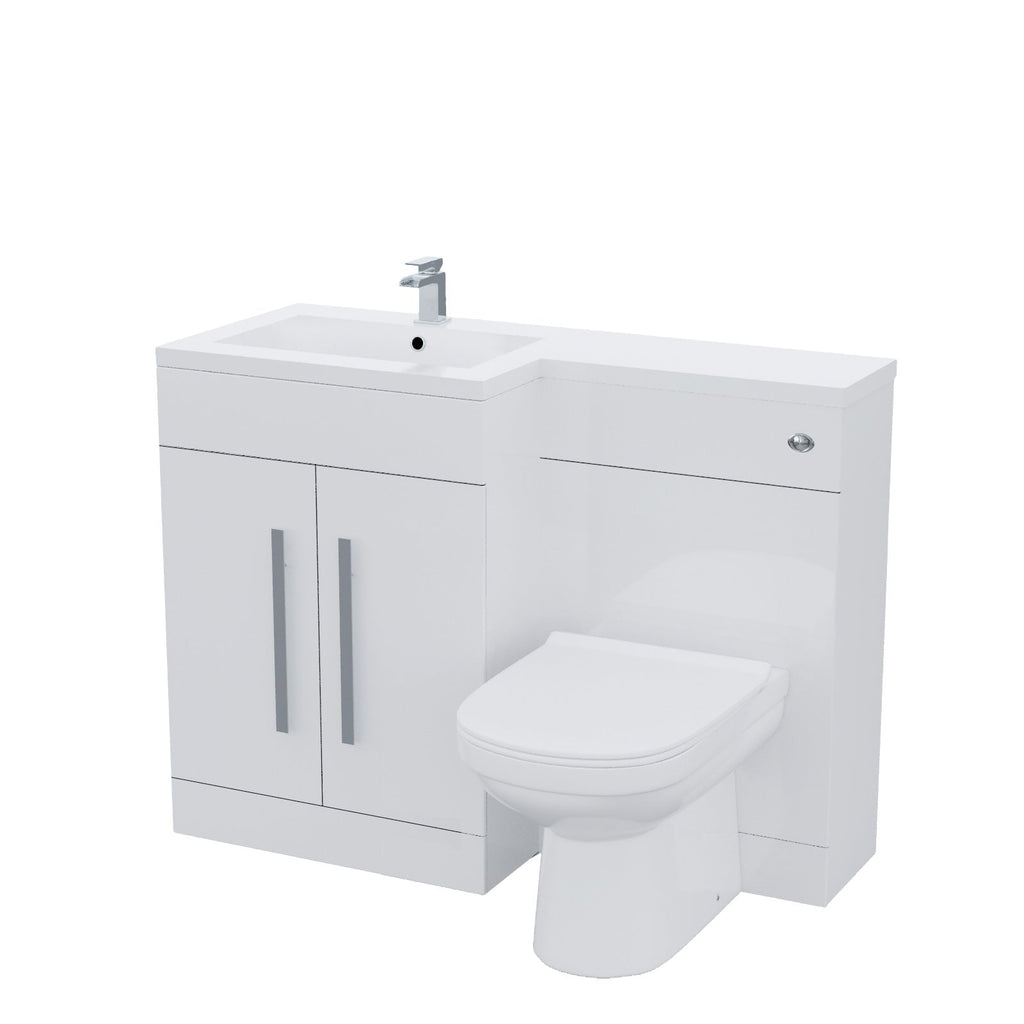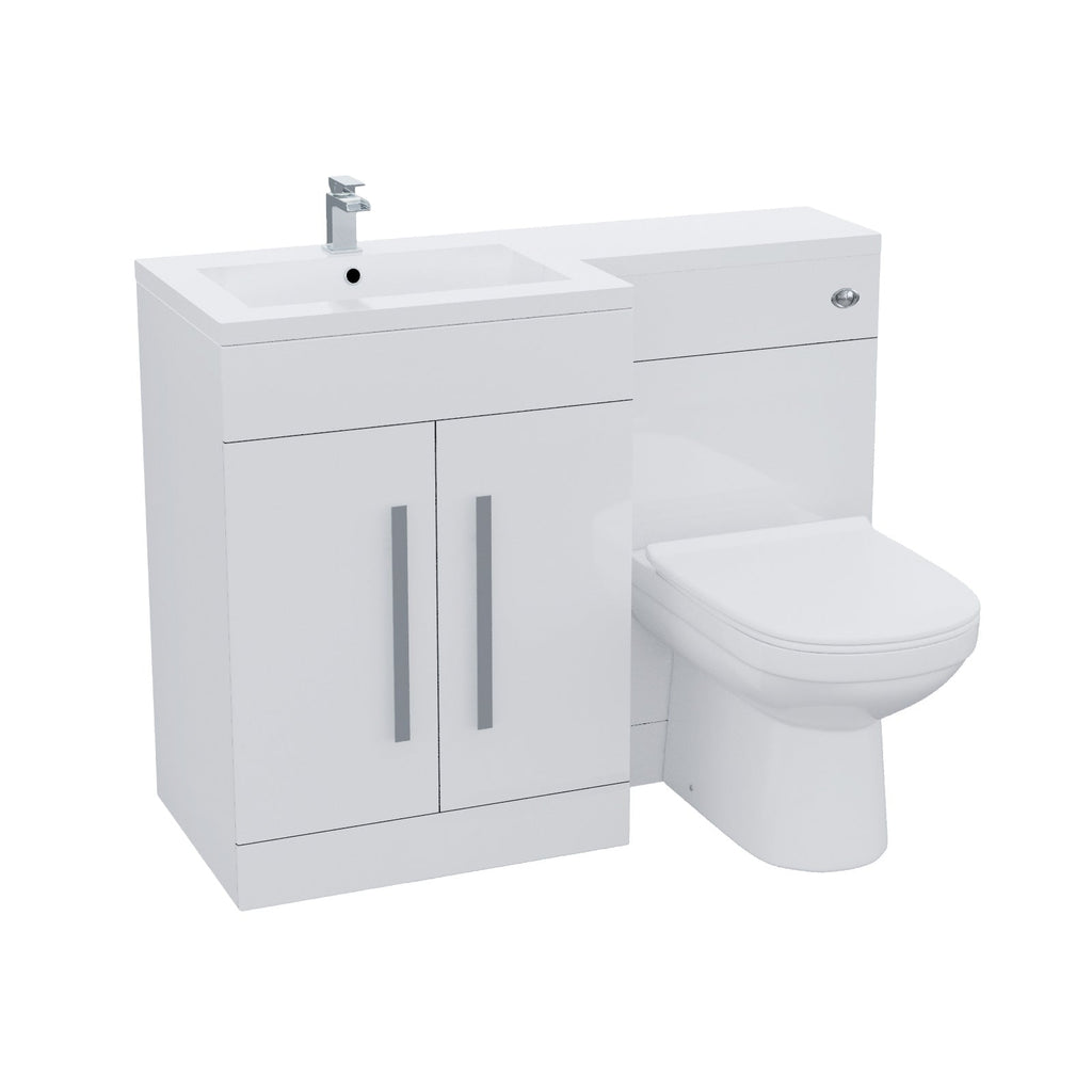 It features a white resin basin top, with a two-door water-resistant MDF cabinet and WC unit and contemporary chrome effect handles, bringing a modern look to your bathroom.
