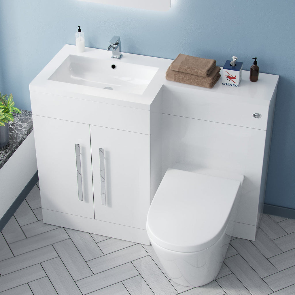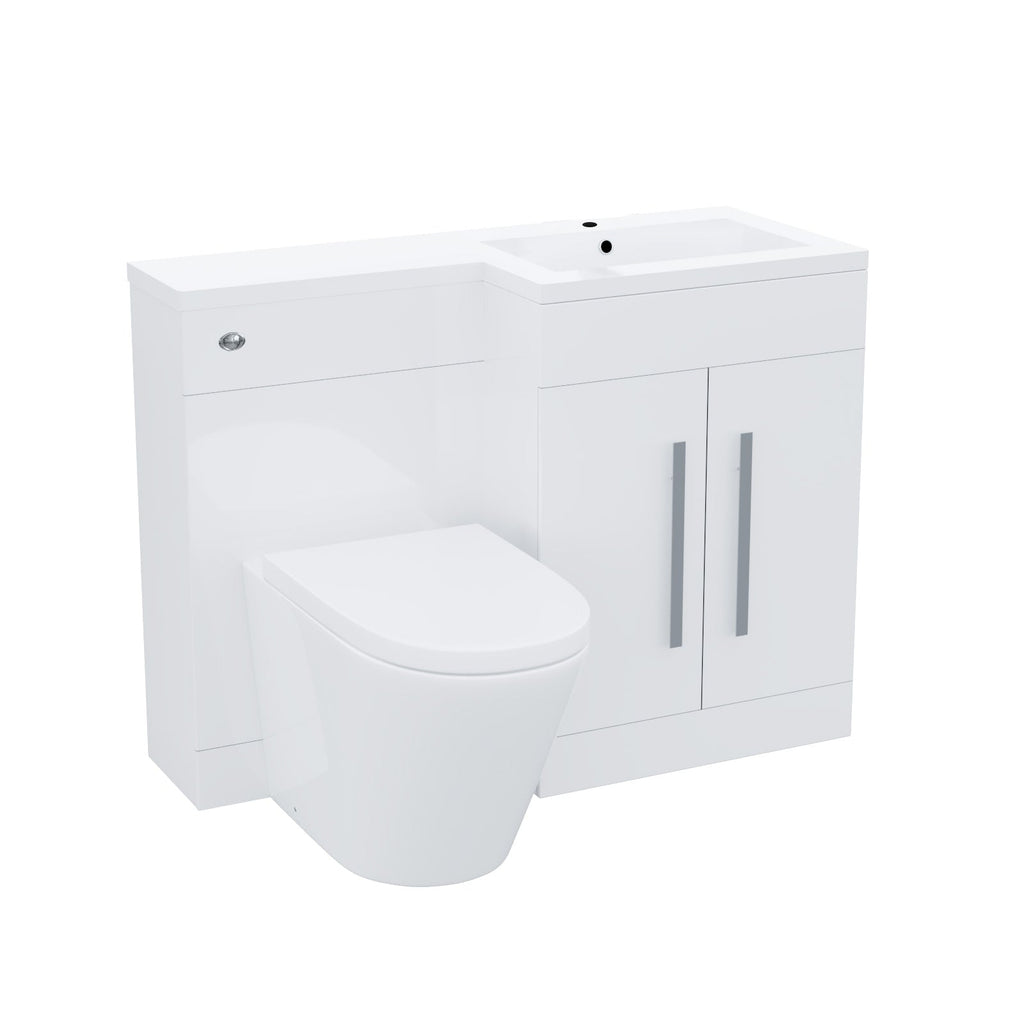 It features a white resin basin top, with a two door water resistant MDF cabinet and WC unit and contemporary chrome effect handles, bringing a modern look to your bathroom. The basin includes an overflow and one tap hole. The contemporary design hides all unsightly pipework creating a neat clean look. The rimless back to wall toilet pan and seat is an ultra-modern designer shape. Mixing with subtle curves and clear cut direct lines. The rimless delivers an ultimate level of hygiene for your bathroom, there is no secret rim where bacteria, germs or limescale can build up.