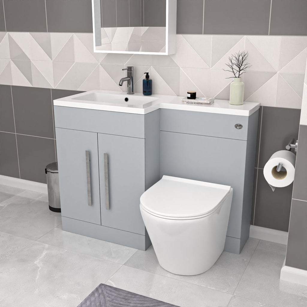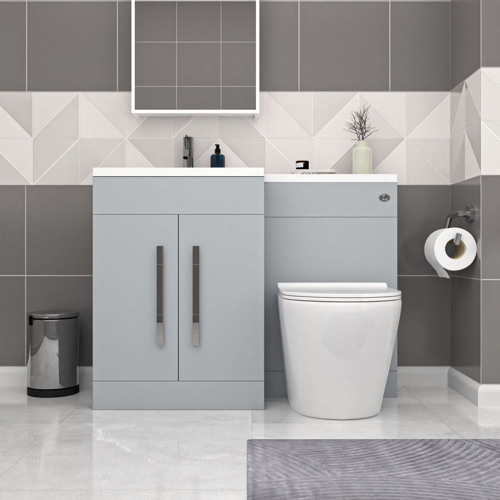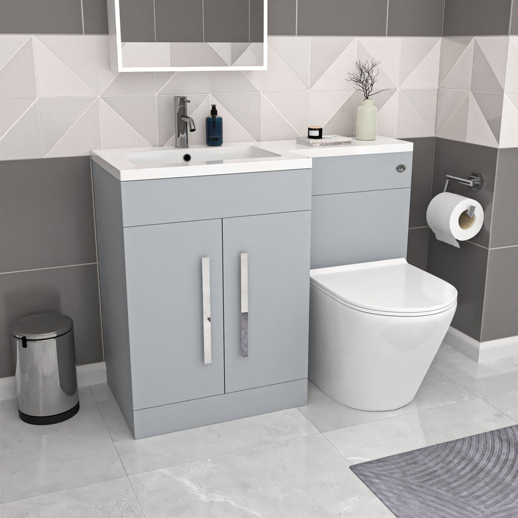 The stylish freestanding combination basin and WC unit with white resin basin top, rimless toilet modern grey bathroom furniture with two doors and contemporary chrome effect handles will bring a trendy look to your bathroom. The basin vanity unit is water-resistant 18mm thick MDF construction, the basin includes an overflow and a soft close door.
