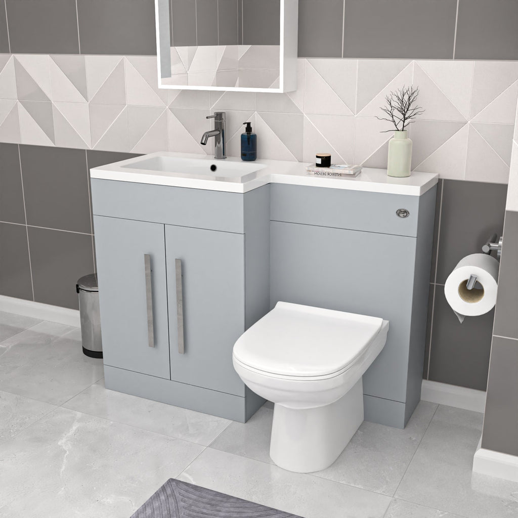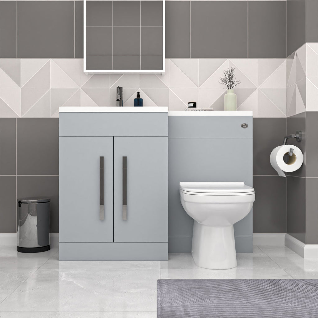 It features a white resin basin top, with a two door water resistant MDF cabinet and WC unit and contemporary chrome effect handles, bringing a modern look to your bathroom.