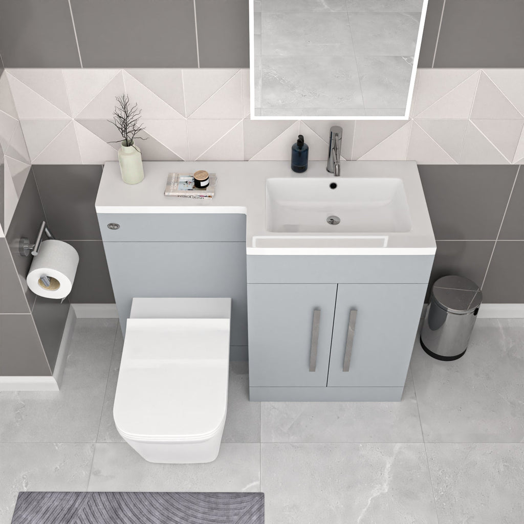 The back to wall toilet pan and seat is an ultra-modern designer shape. Mixing with subtle curves and clear cut direct lines, this toilet is made from Vitreous China, covered with a high gloss finish which makes the toilet stand out. The stylish freestanding combination basin and WC unit with white resin basin top with an overflow and soft closing doors, it is of white bathroom furniture and contemporary chrome effect handles which will bring a trendy look to your bathroom. The basin vanity unit is water-resistant 18mm thick MDF construction.