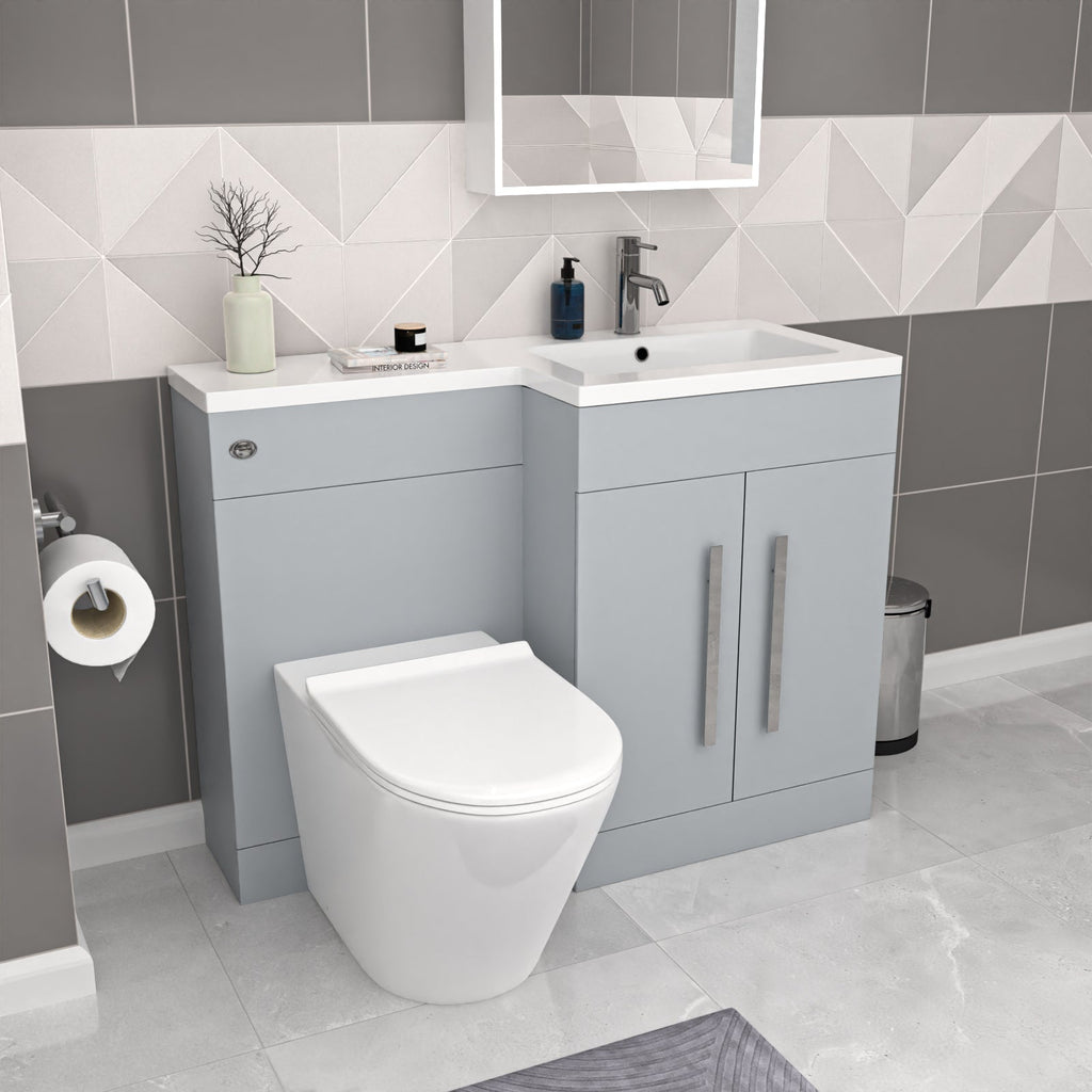 This stylish freestanding combination basin and WC unit with white resin basin top with an overflow and soft closing doors, it is of grey bathroom furniture and contemporary chrome effect handles which will bring a trendy look to your bathroom. The basin vanity unit is water resistant 18mm thick MDF construction.