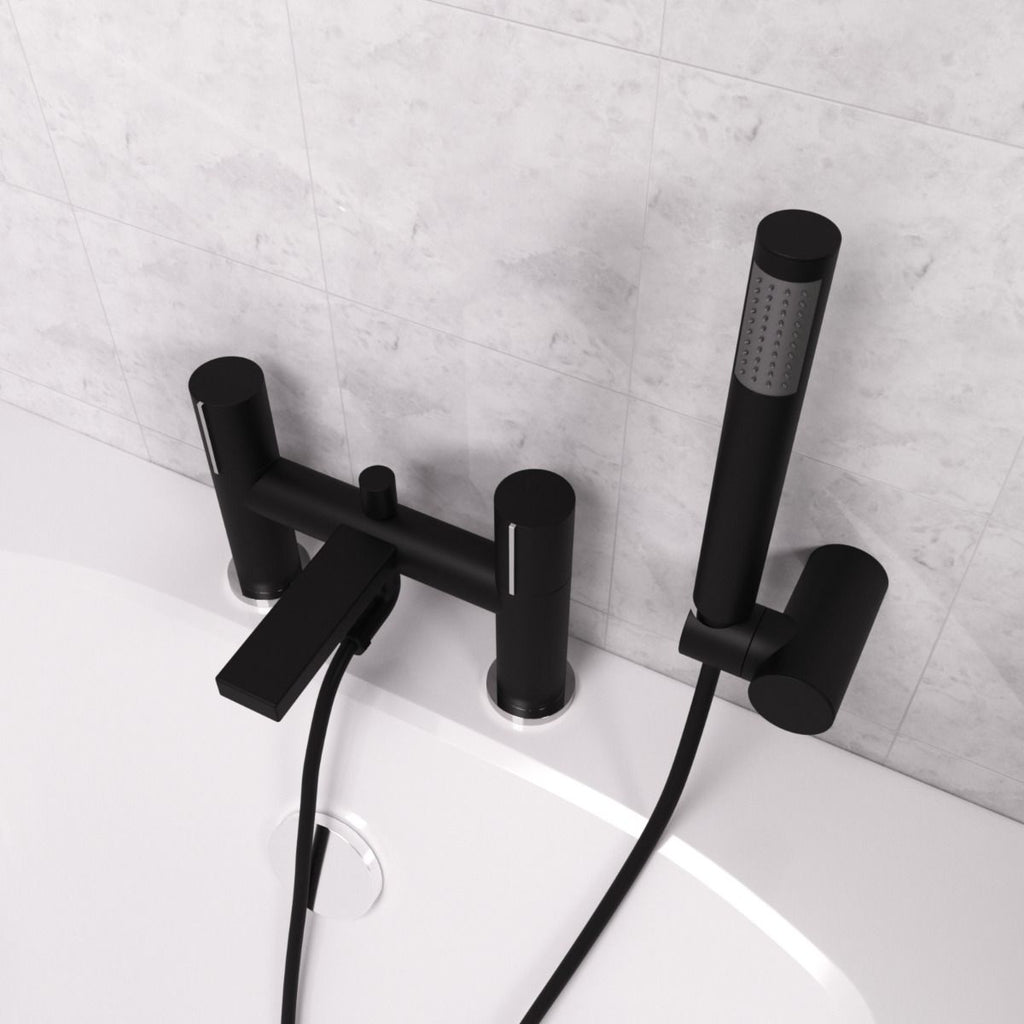 Futuristic and modern handleless matt black bath shower mixer tap with handset shower and holder will give your tub a modern look.