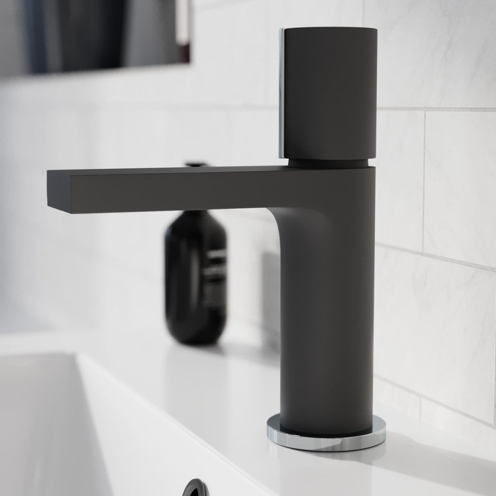 This stunning deck mounted tap features a round knob that controls water, perfect for creating an eye catching modern look in your bathroom. Plated in anodised matt black finish making it highly resistant to corrosion.