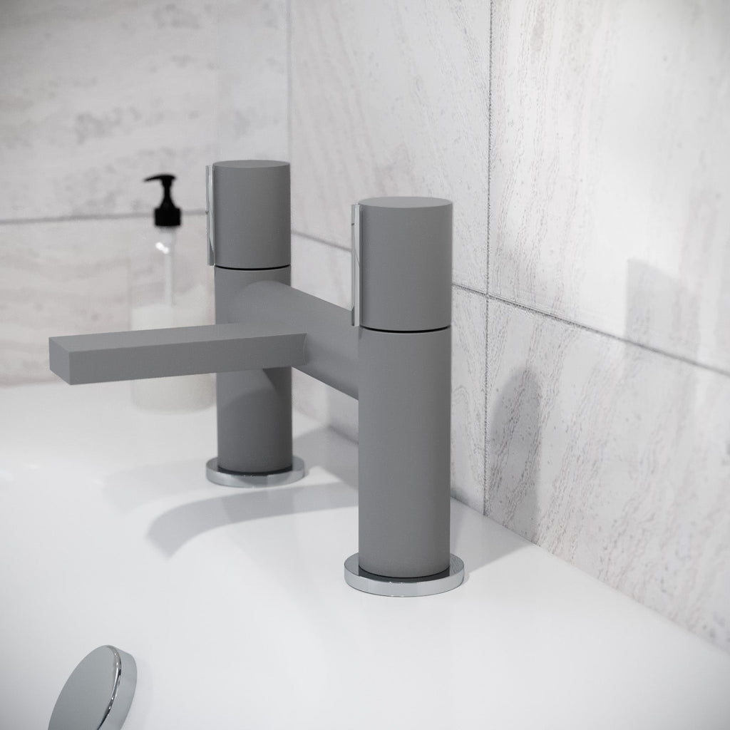 This minimalist bath filler mixer tap has a sleek round and angular profile, constructed from high quality brass material with a stunning matte grey finish.