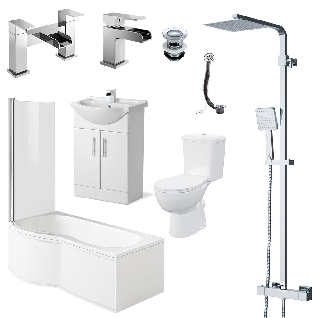 Complete package including a P-shaped bath with screen and panel, close-coupled toilet with cistern and seat, vanity basin unit with tap, bath filler tap, basin mixer tap, shower set with overhead and handset, plus wastes. Perfect for a stylish, all-in-one bathroom upgrade.