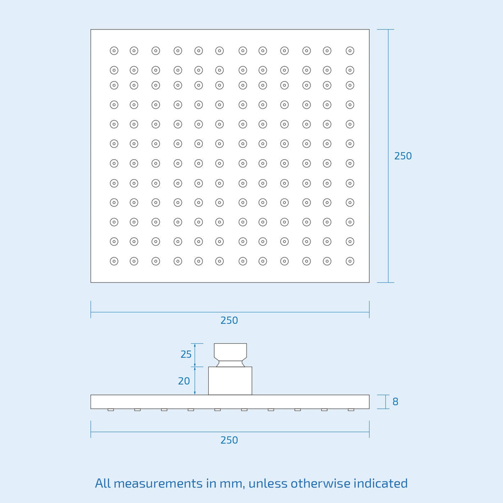 A modern, simple but elegant 250mm shower head, with a swivel joint, for tilting and ease of use. Gentler than traditional shower heads, but remains effective and vitalising by concentrating water flow through each of the individual nozzles.