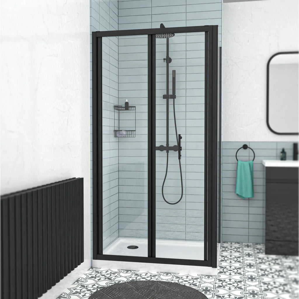 This ultra-stylish bi-folding door and side panel shower enclosure is set to add elegance into the bathroom and perfect for small spaced bathrooms. Made from 1 mm aluminium profile and coated in a stunning matte black finish along with stainless steel handles. The glass panels on the shower enclosure are created from 6 mm tempered clear glass.