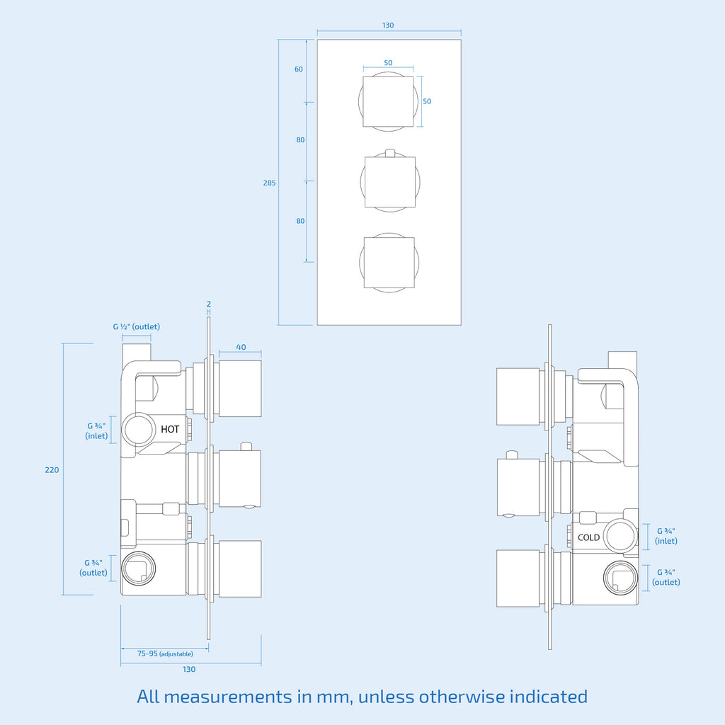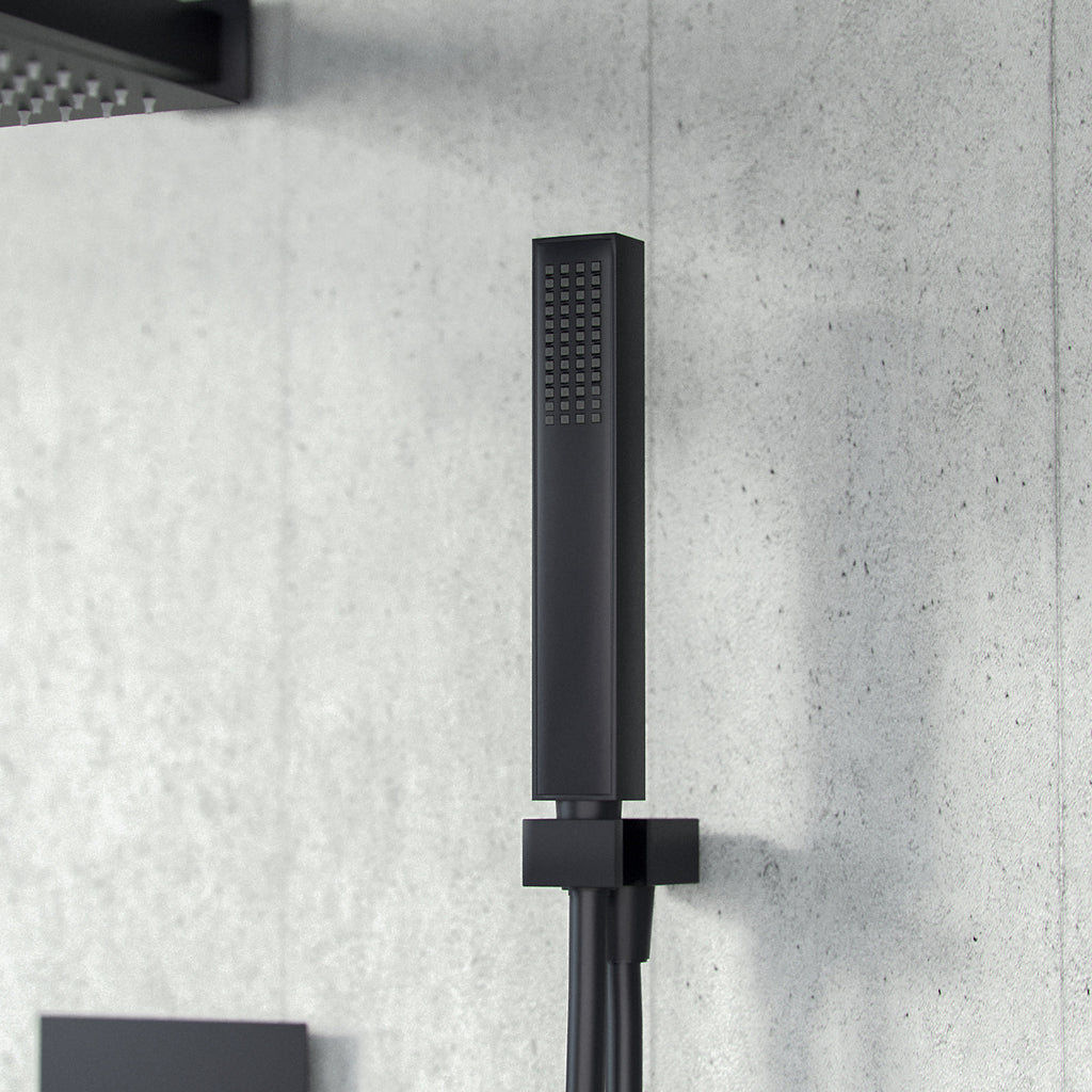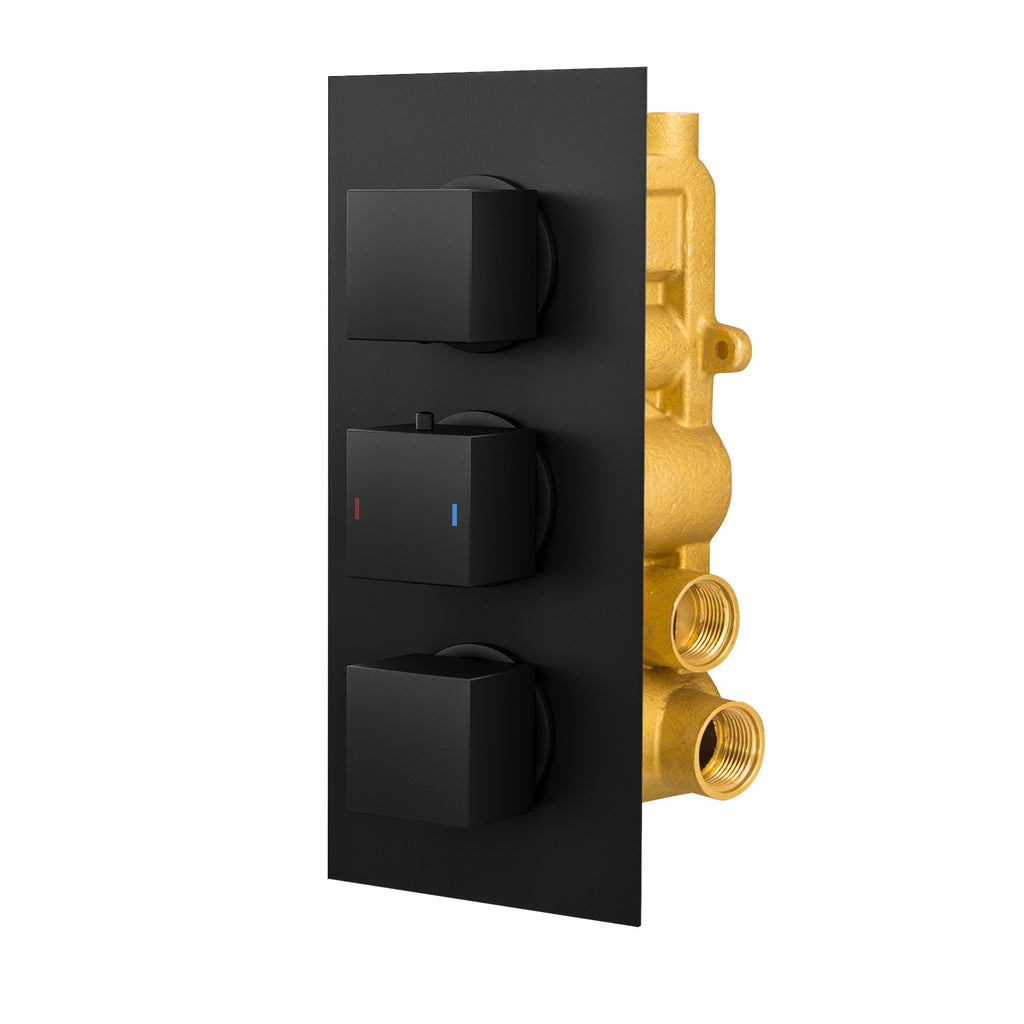 Constructed from solid brass, with modern ceramic disc technology, our stylish concealed thermostatic shower mixer valve is perfect for creating a new minimalist look to your bathroom. The mixer valve mounts on to the wall making your shower look less cluttered and bulky and the slim rectangular back plate neatly conceals all pipe work, adding an exceptional sleek finish. Featuring classic square dials - the mixer valve supplies water to 2 outlet diverters and is finished in stunning matt black, leaving am, making your taps look new for longer. The thermostatic showering can be accessed via the 3 dial 3 way easy-to-operate dial controls - separate controls for temperature and flow; giving you full temperature control. A coordinating fixed wall mounted overhead shower with a swivel joint and arm for ease of use come complete with the mixer valve. Please note: These product comes with a 10 year guarantee.