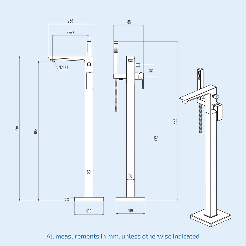 Modern style freestanding floor-mounted bath filler tap, add a luxury and modern stylish touch to your bath. It’s a beautifully made bath filler tap with a contemporary functional design. It features solid brass construction, a 3-layer PVD Chrome finish, a curved spout, an integrated shower kit with a handset and hose, and a single lever ceramic cartridge.
