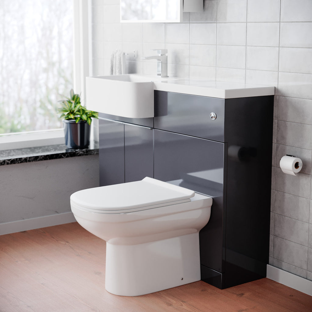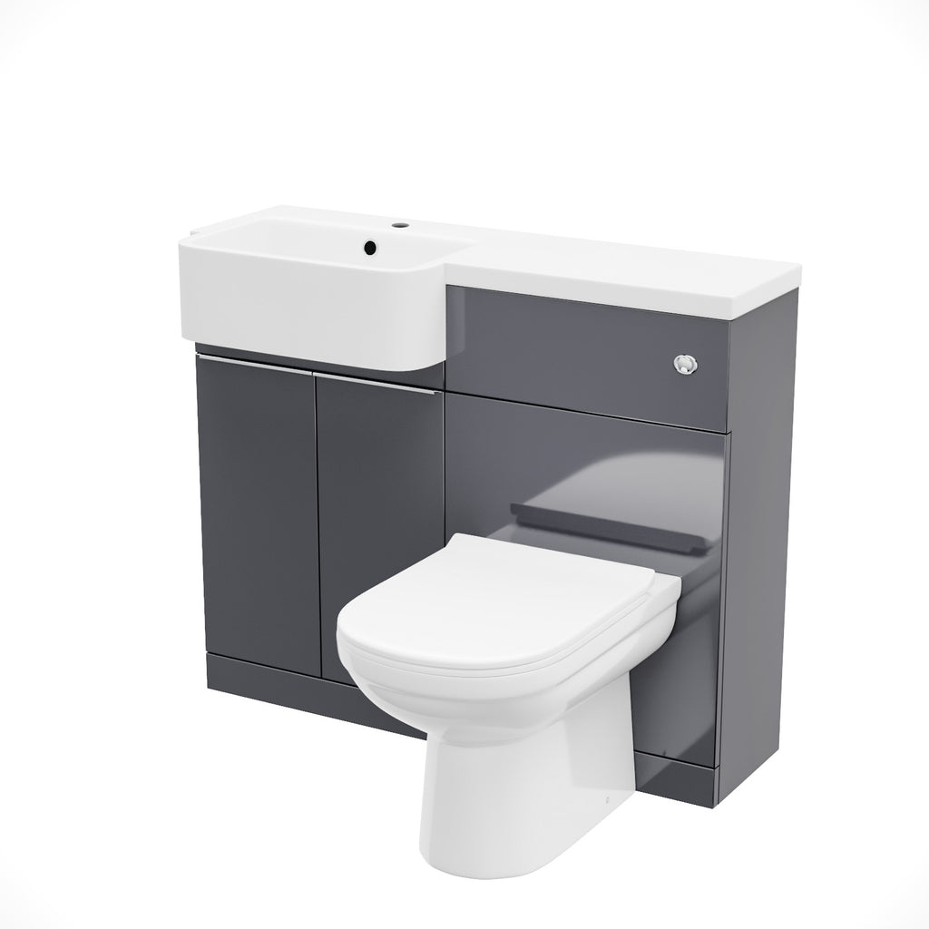 The 1000mm Bathroom Toilet & Basin Set in steel grey featuring a chrome finish handle, is a versatile and super minimal addition to any bathroom. This all-in-one unit comes complete with a basin, WC unit, and toilet, offering functionality and super minimal style all in one package. The left or right configuration ensures seamless integration into your bathroom layout.