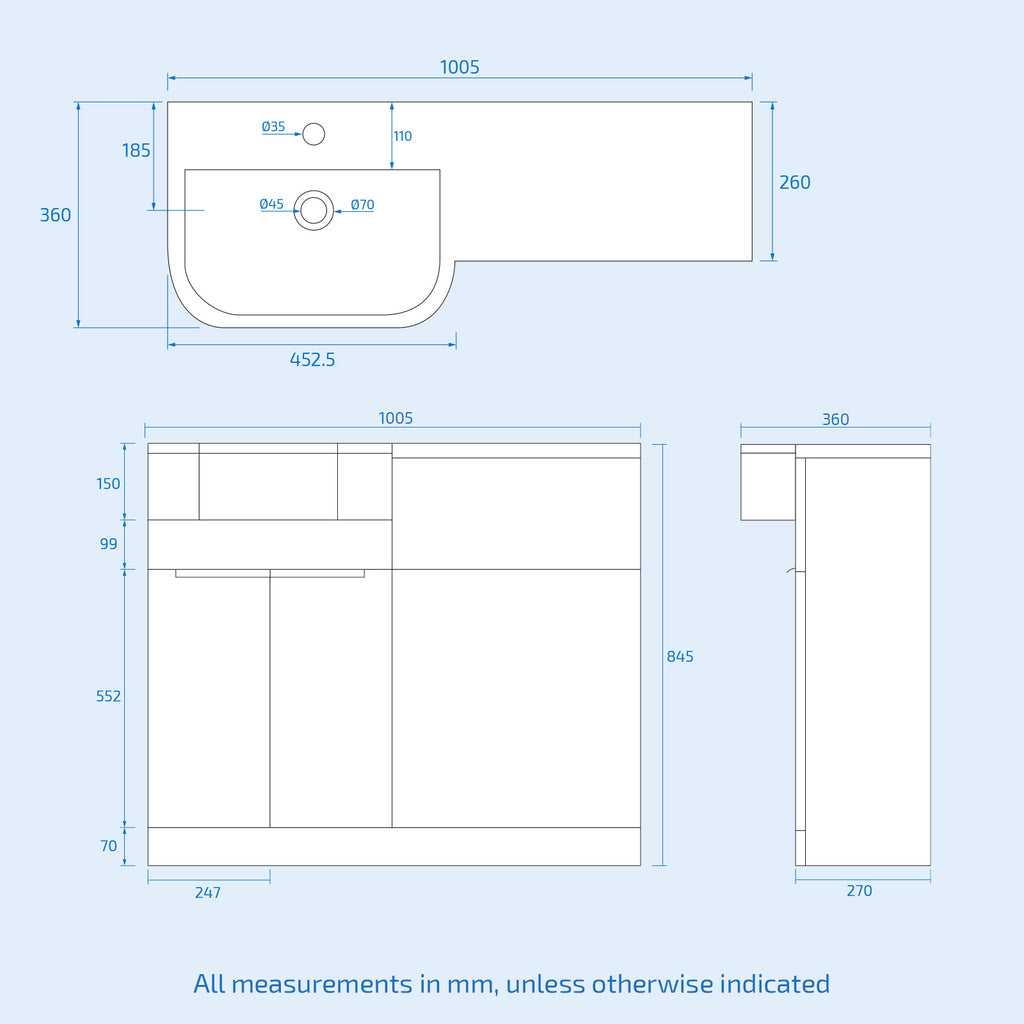 - Furniture Width (Unit + Basin): 1005mm