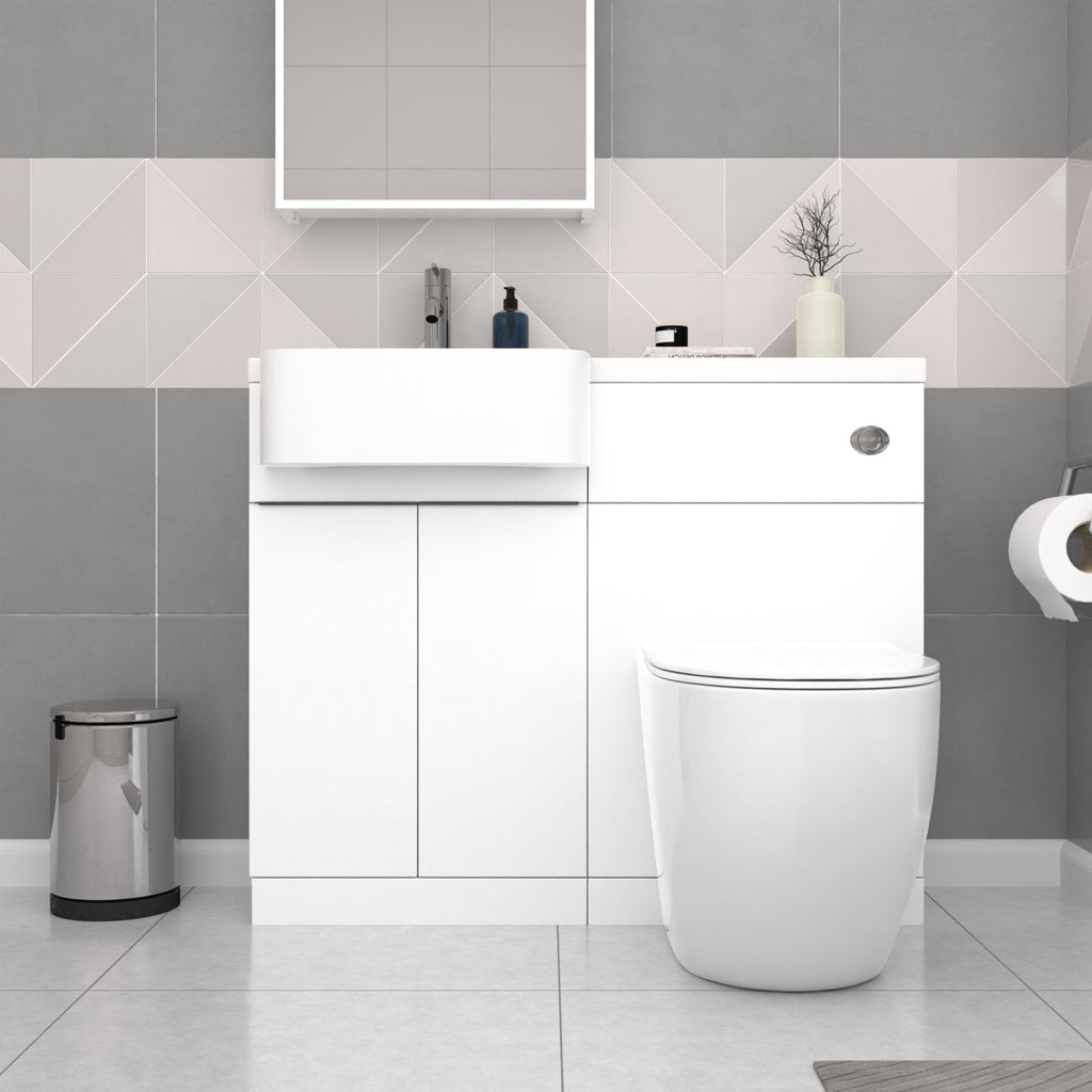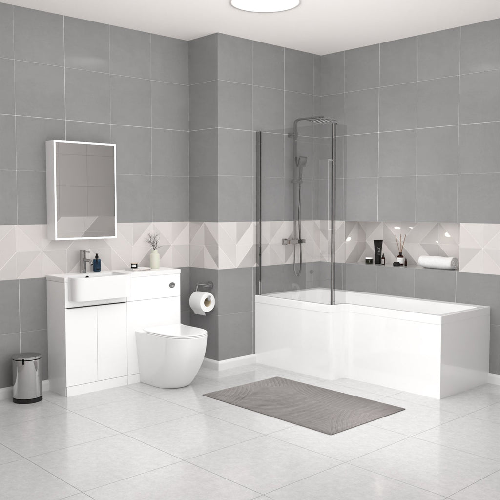 The Nes Home Black Handle LH Basin WC Unit BTW Toilet L Shape LH Bath & Panel & Screen is a versatile and stylish bathroom suite. It features a modern L-shaped shower bath, providing ample space for both bathing and showering. The floor-standing vanity unit comes with a white basin, offering a sleek and functional storage solution for your bathroom essentials. Additionally, the back-to-wall (BTW) toilet ensures a neat and tidy appearance with its concealed cistern. This suite combines contemporary design with practicality, making it a great choice for any bathroom space.