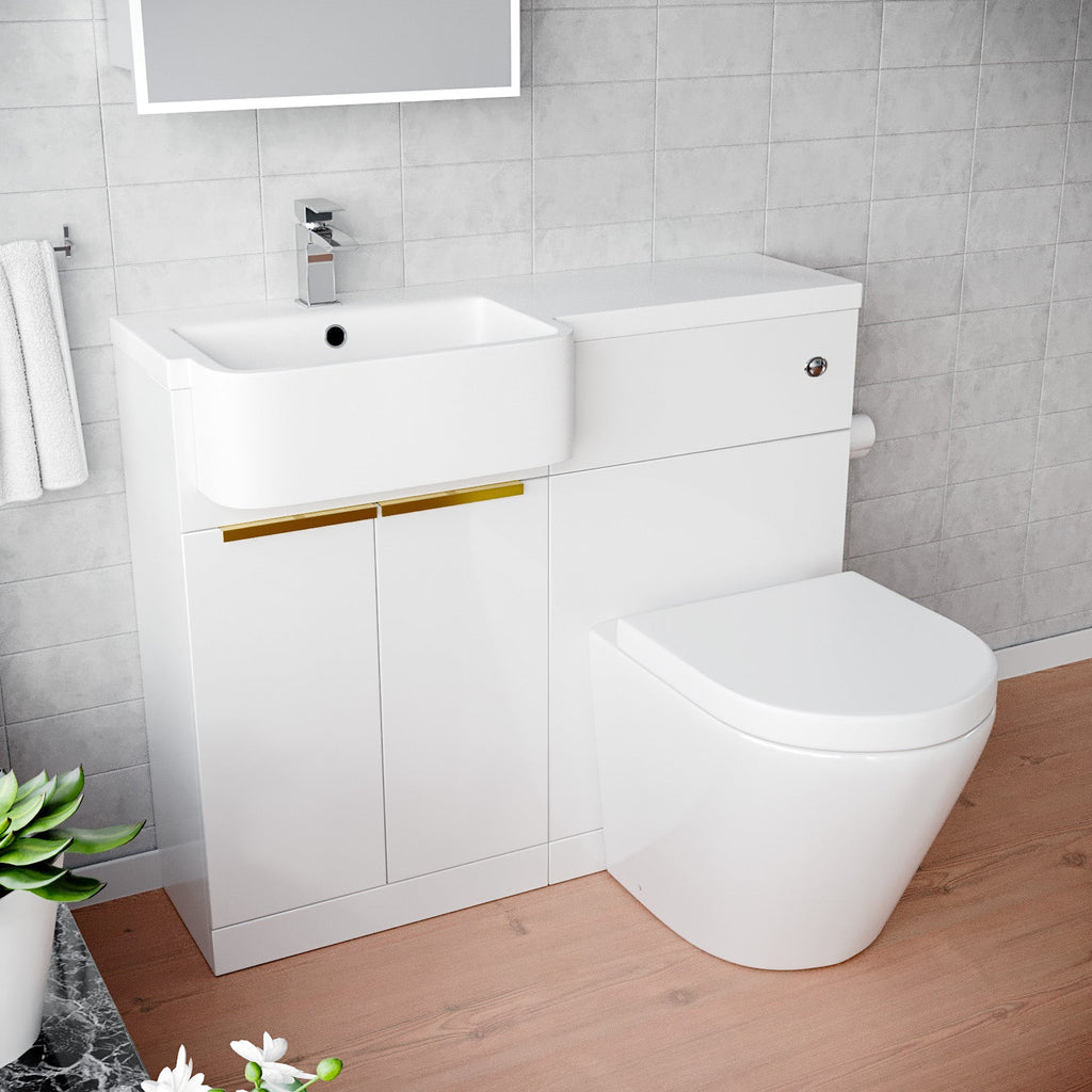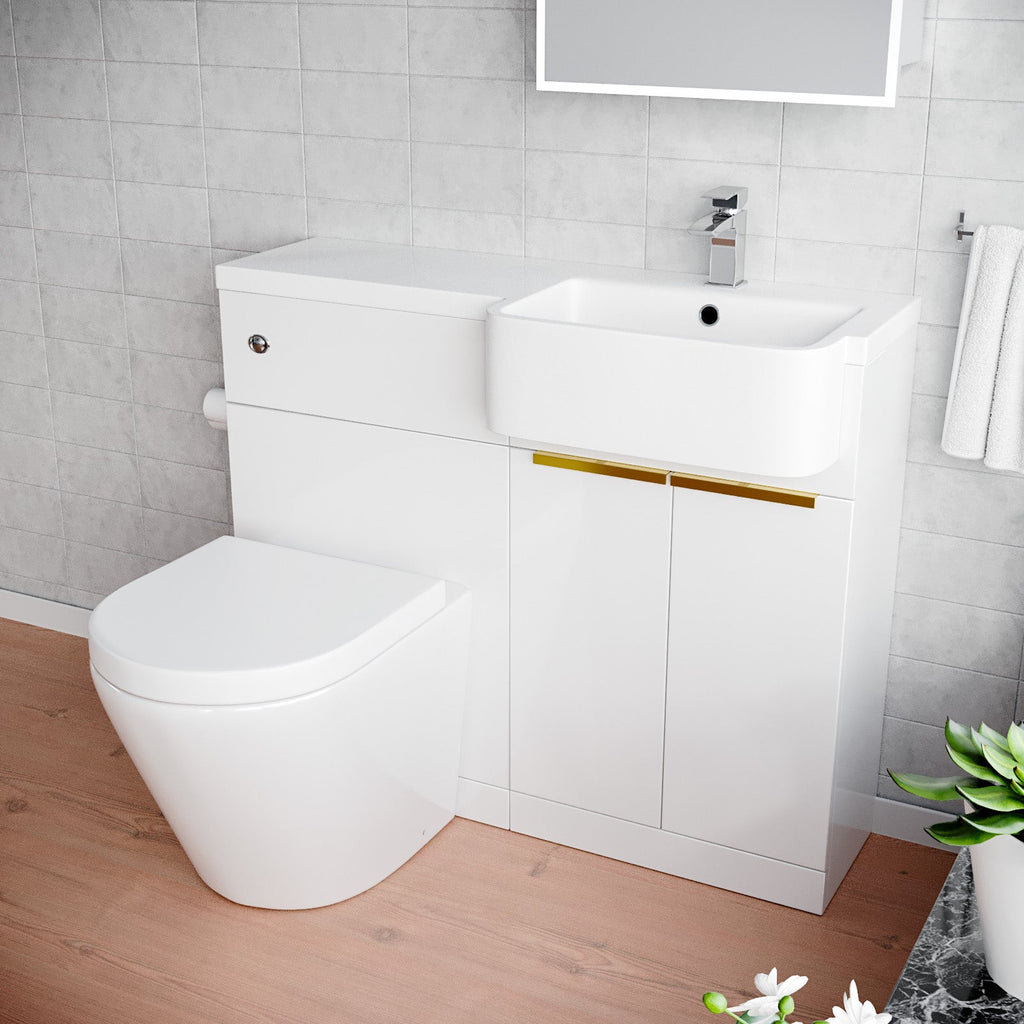The 1000mm Bathroom Toilet & Basin Set in gloss white featuring a gold finish handle, is a versatile and super minimal addition to any bathroom. This all-in-one unit comes complete with a basin, WC unit, and toilet, offering functionality and super minimal style all in one package. The left or right configuration ensures seamless integration into your bathroom layout.