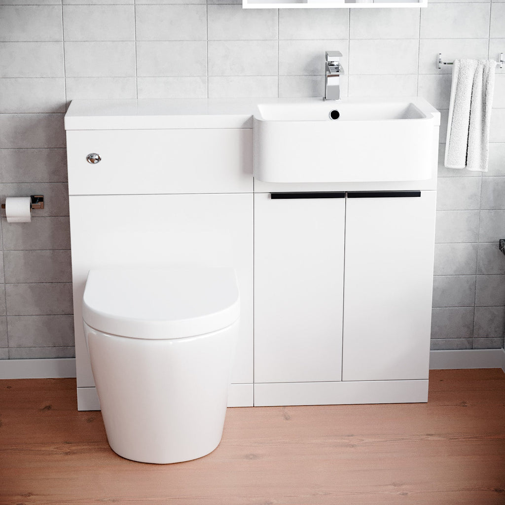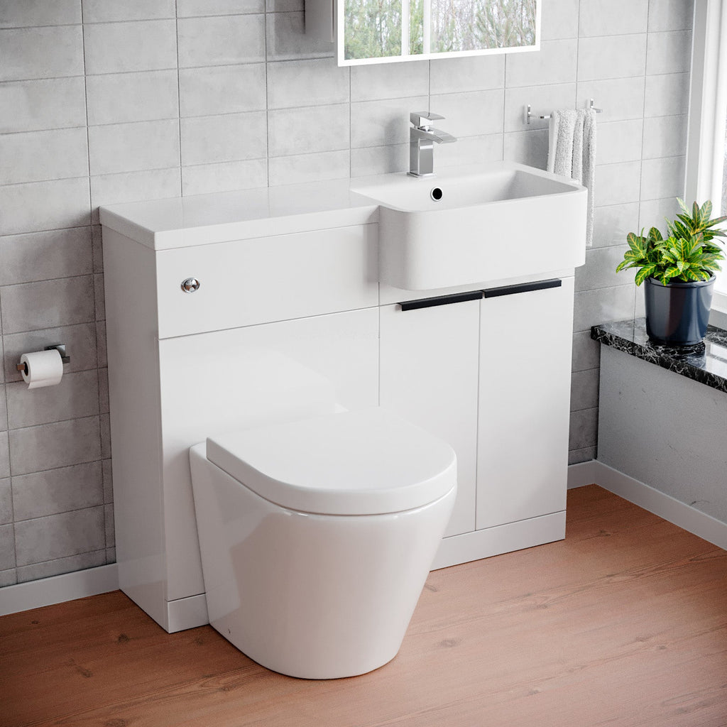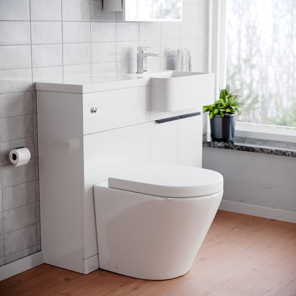 The 1000mm Bathroom Toilet & Basin Set in gloss white featuring a black finish handle, is a versatile and super minimal addition to any bathroom. This all-in-one unit comes complete with a basin, WC unit, and toilet, offering functionality and super minimal style all in one package. The left or right configuration ensures seamless integration into your bathroom layout.