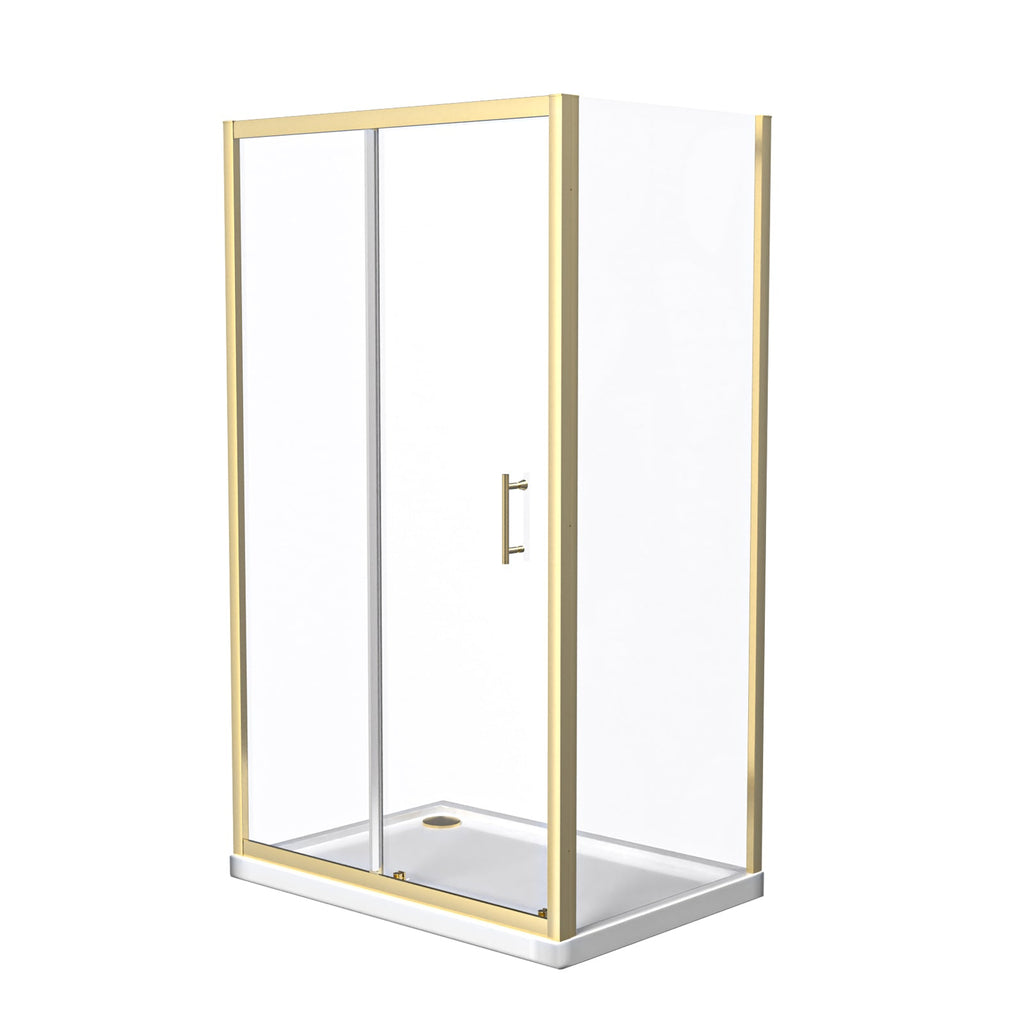 This shower enclosure has a tempered glass sliding door and comes in a brushed brass finish. This enclosure can be created by placing the sliding door and side panel as an L-shape cubicle in the corner of your bathroom. The brushed brass finish will compliment contrasting light or dark coloured interiors and gives a modern look to the corner of your bath or shower room. Matching taps and mirrors are also available. The sliding door is particularly useful as it will help you to save space by not opening out into the room. Additionally, the glass panels on the shower enclosure are created from 6 mm premium tempered clear glass. For easy installation of the sliding door, the aluminium frame allows for a 40 mm wall adjustment for when the walls are slightly out.