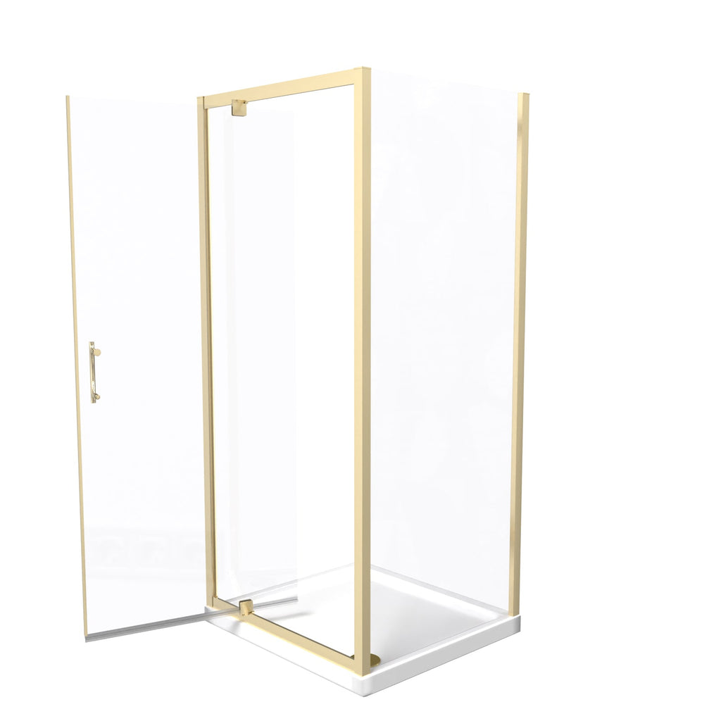 This pivot shower door enclosure with a brushed brass finish comes as a glass panel screen that can be placed as an L-shaped cubicle in the corner of your bathroom. The brushed brass finish will compliment contrasting light or dark coloured interiors and gives a modern look to the corner of your bath or shower room. The best feature is the functionality of the reversable pivot door which can be installed to open from right to left or left to right depending on what suits you! Matching taps and mirrors are also available.