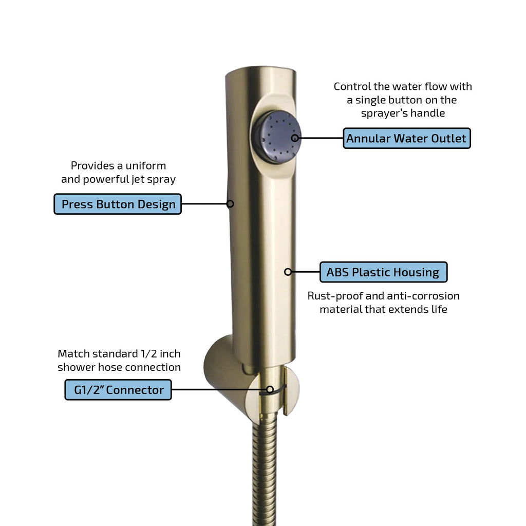 This plastic bidet spray head features a brushed gold finish that resists daily scratches and corrosion. Its press-button design allows for easy water flow control, unlike traditional lever-operated sprayers. With a G 1/2 inch universal connection, it’s simple to install on most standard shower hoses. Versatile for various uses, it can function as a cloth diaper sprayer, kitchen side sprayer, bathroom cleaner, pet shower, or for washing fruits.