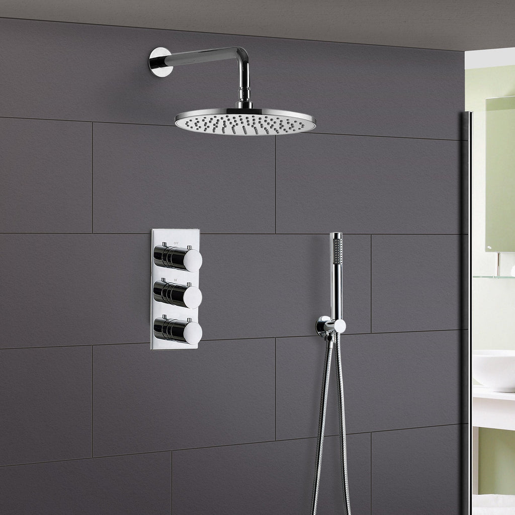 Featuring classic round design dials with short levers for fingertip control, the mixer valve supplies water to 2 outlet diverters and is finished in stunning chrome, leaving a silky-feel surface and a highly reflective mirror-like sheen, making your shower look new for longer. The thermostatic showering can be accessed via the 3 dials 2-way easy-to-operate dial controls - separate controls for temperature and flow; giving you full temperature control. A coordinating fixed overhead shower with a swivel joint and arm for ease of use and a handset shower comes complete with the mixer valve tap.