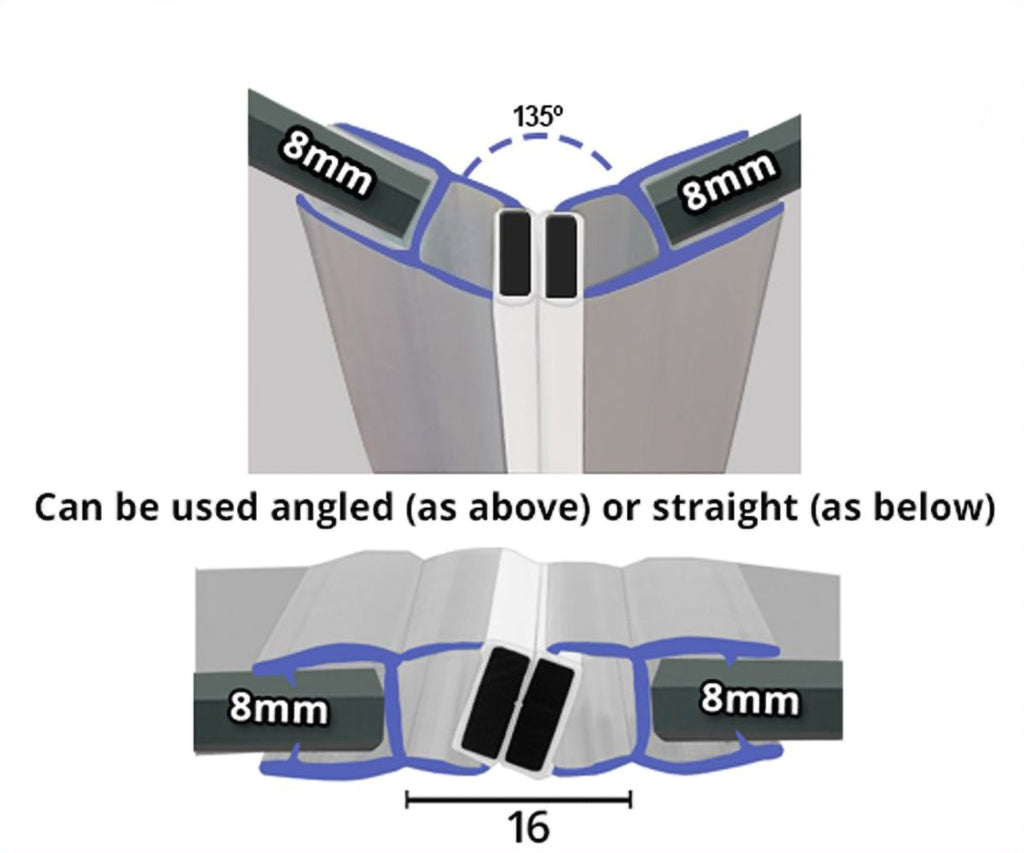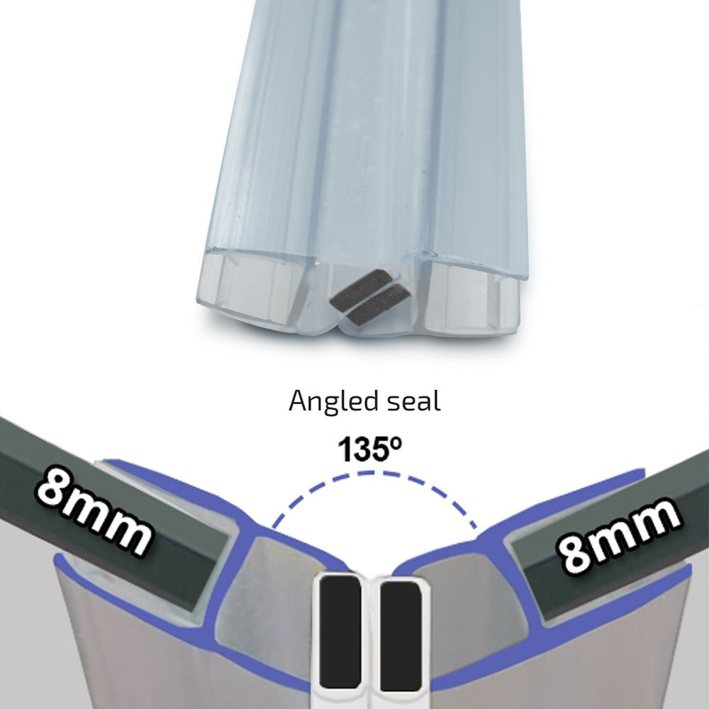 Clear shower screen seals with magnetic connection for interfaces between the edge of the shower door and the fixed glass panel jointed at 135°.