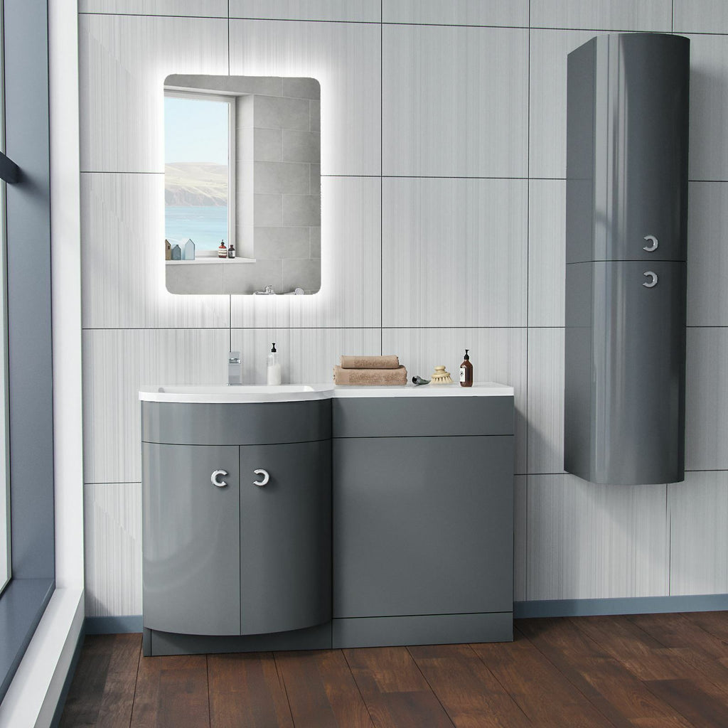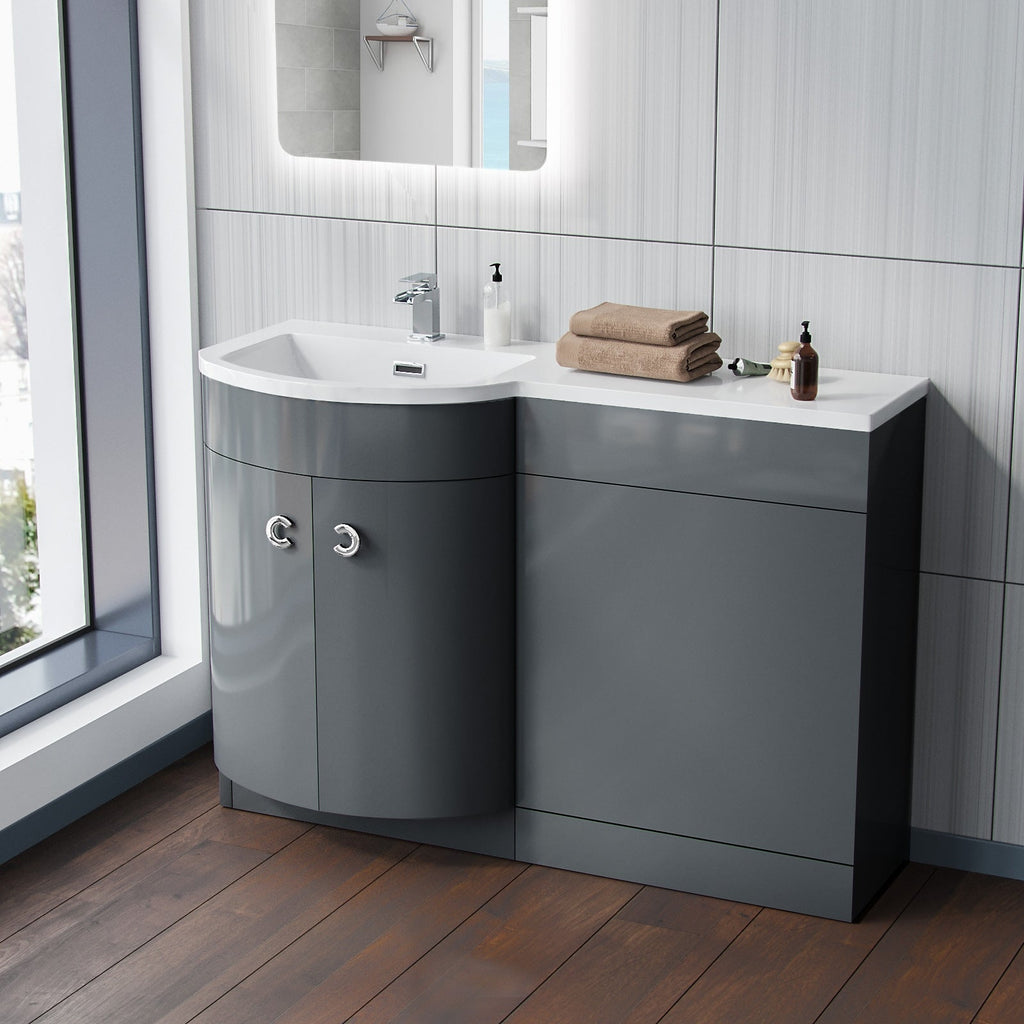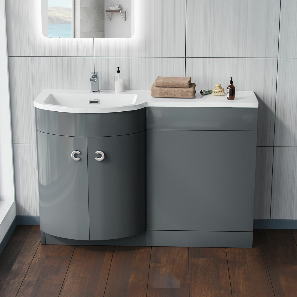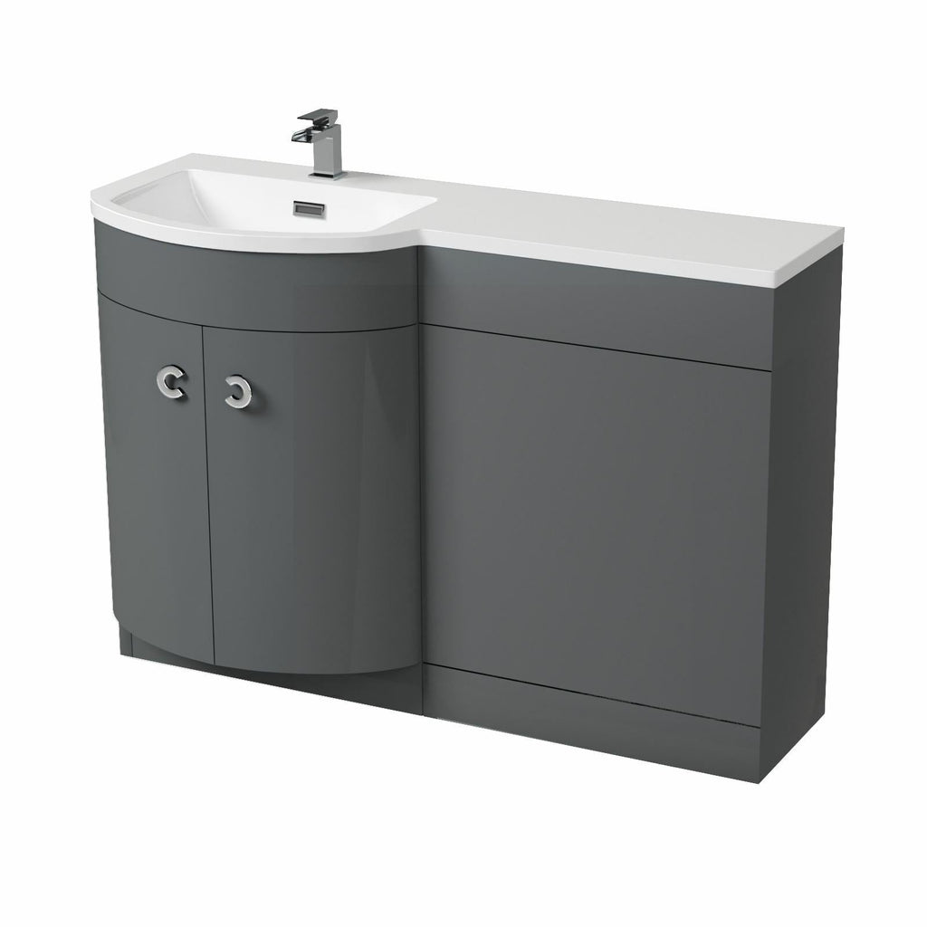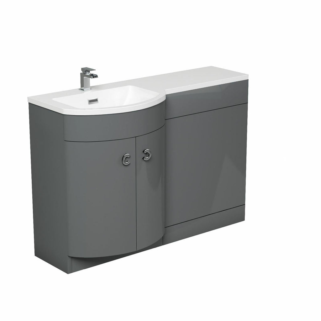 The stylish freestanding combination basin and WC unit with white resin basin top, modern grey bathroom furniture with two doors and contemporary chrome effect handles which will bring a trendy look to your bathroom. The basin vanity unit is water resistant 18mm thick MDF construction, the basin includes an overflow and a soft close door.