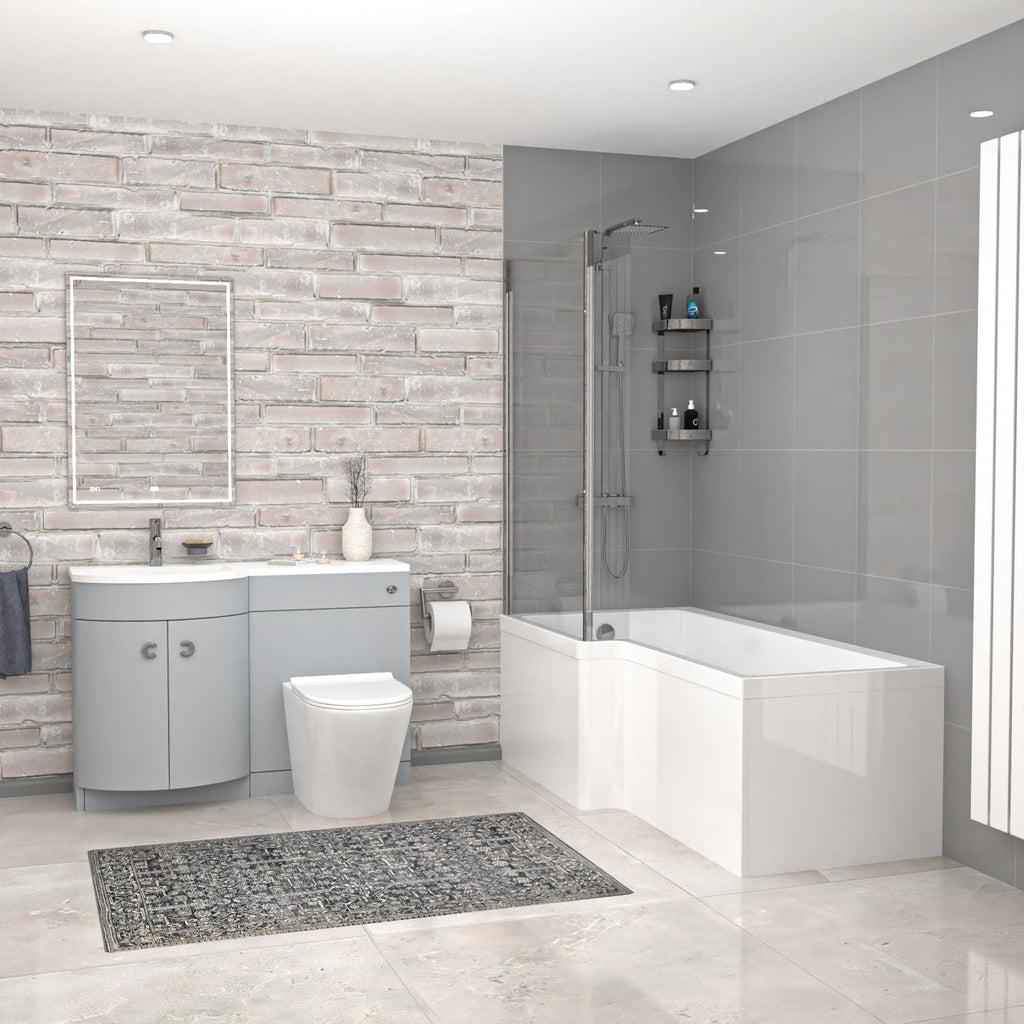 The Home L-Shaped LH Shower Bath Set is a comprehensive bathroom solution that combines style and functionality. This set includes an L-shaped shower bath, a sleek basin vanity unit, and a back-to-wall (BTW) toilet. The shower bath provides ample bathing space, while the basin vanity unit offers convenient storage and a modern aesthetic. The stylish Dene curved floor standing combination basin and WC unit with resin basin top, modern bathroom furniture with two curved doors and contemporary chrome effect handles which will bring a trendy look to your bathroom. It's trendy design hides all unsightly pipework creating a neat clean look.